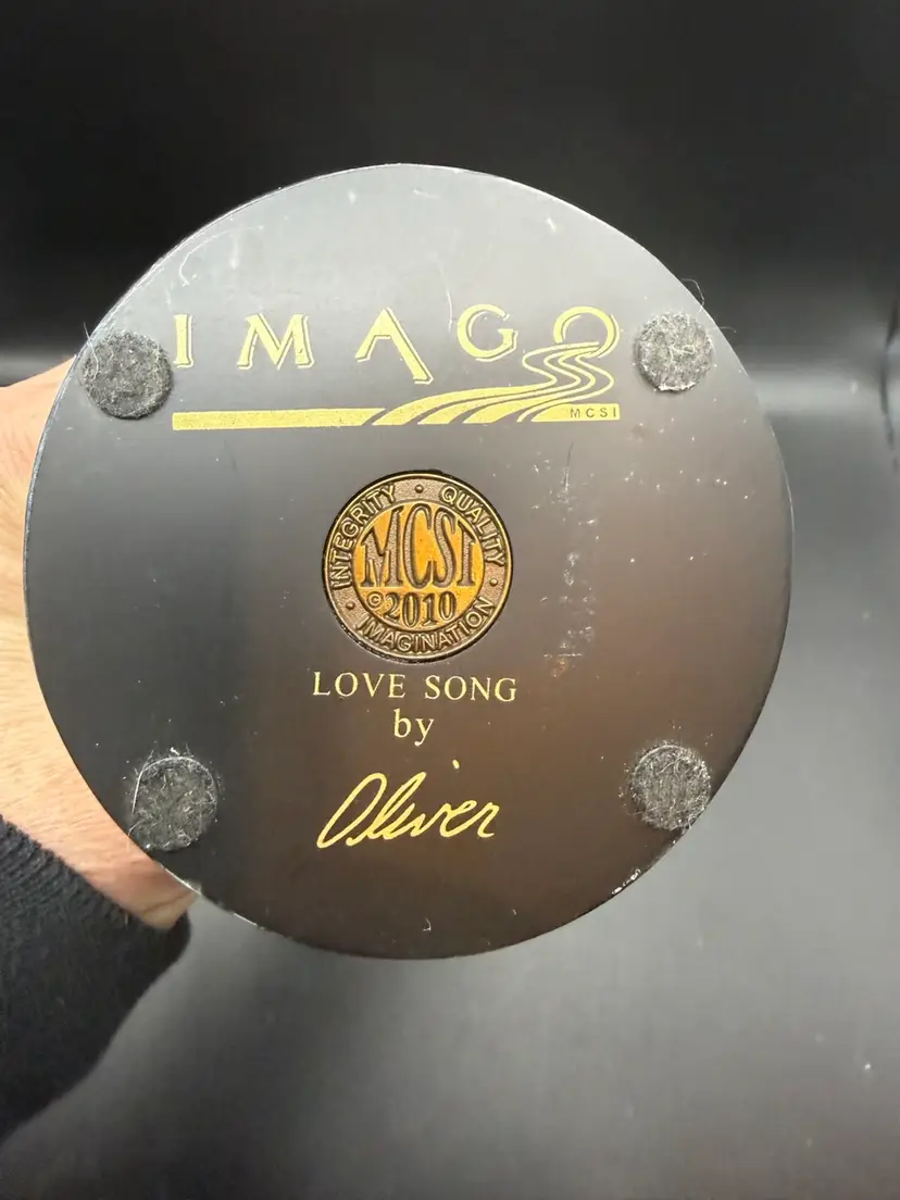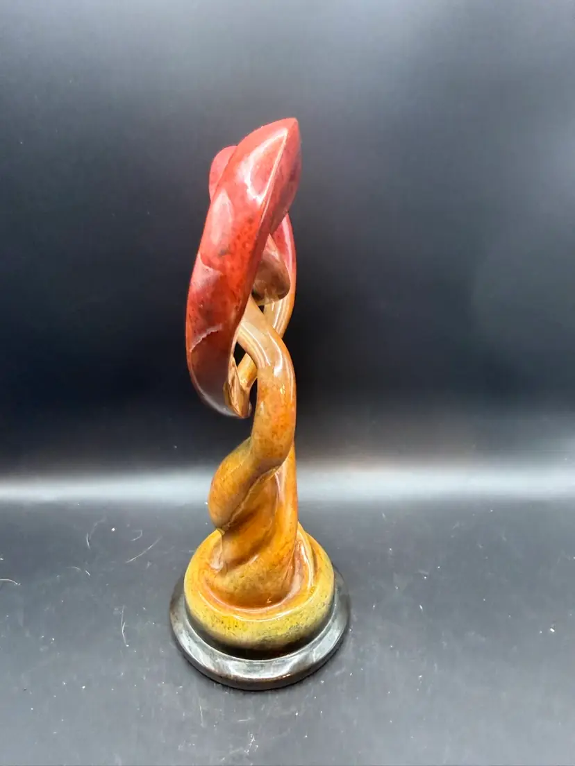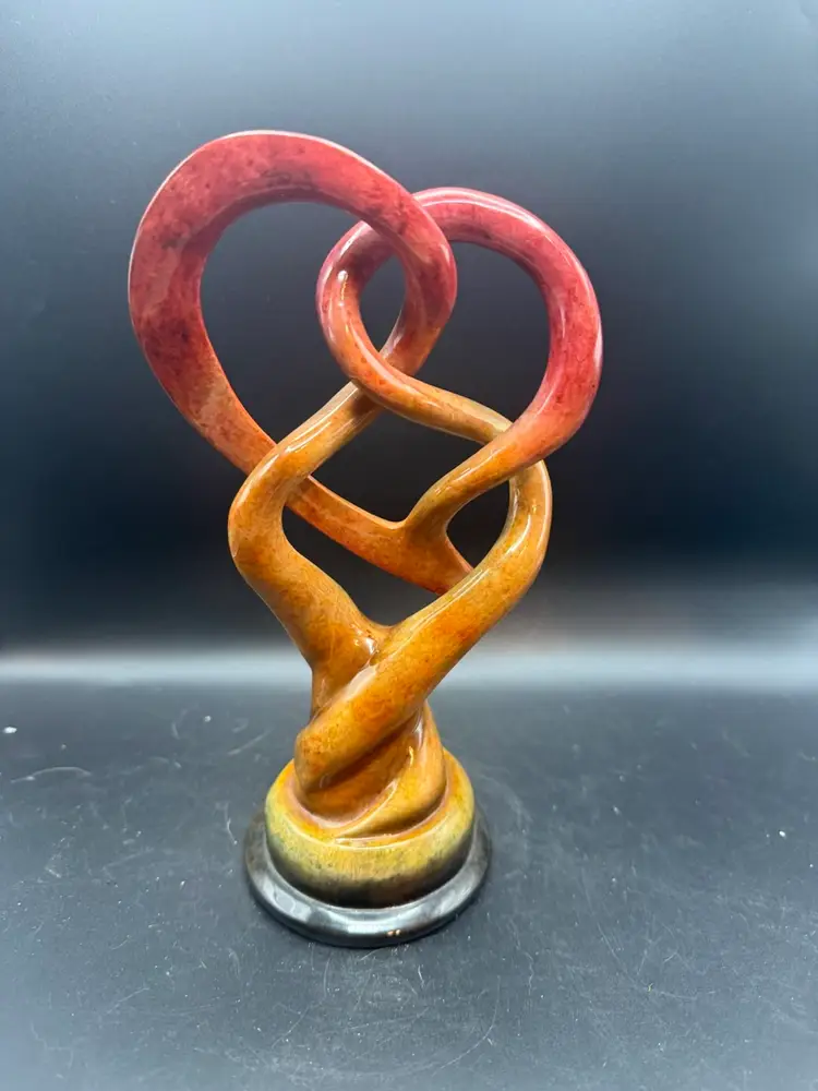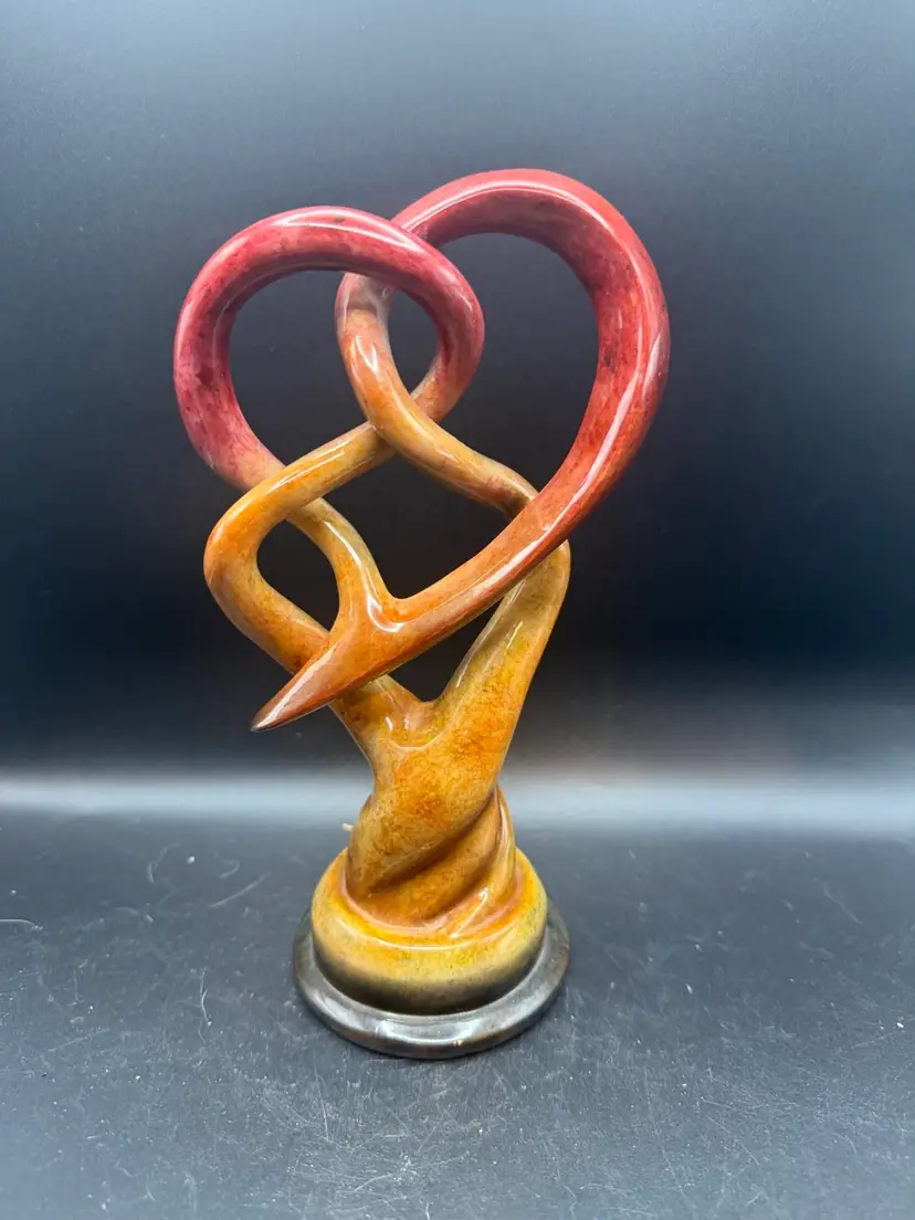 The abstract sculpture depicts an infinity loop in the shape of a heart, symbolizing themes of love. It is made of cold-cast resin with a high-gloss finish, featuring warm yellow, orange, and red tones. The piece was produced by Wild Wings and MCS International (MCSI). The sculpture stands around 8 inches tall.