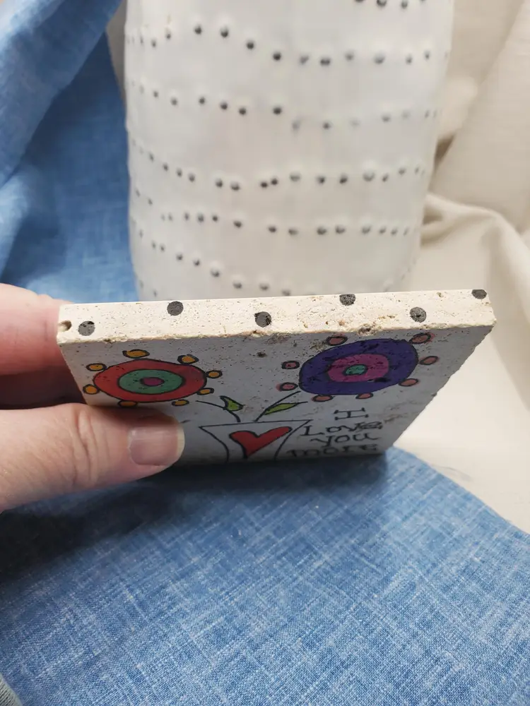 4" x 4" natural stone tiles wall art. Painted with India inks. Each is Handpainted by me in my Northern Illinois Home Studio. I enjoy painting on natural stone as their variations help to create one of a kind look!