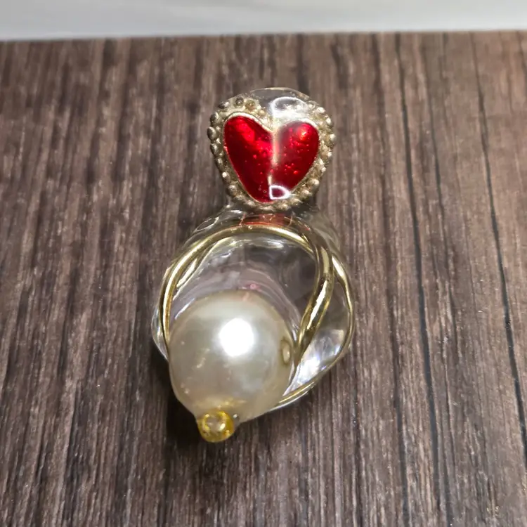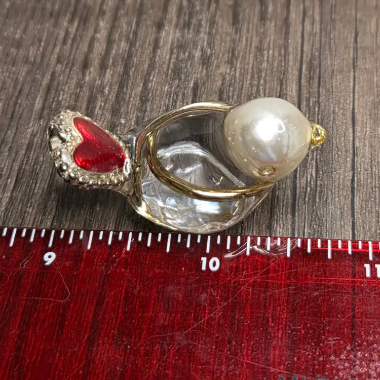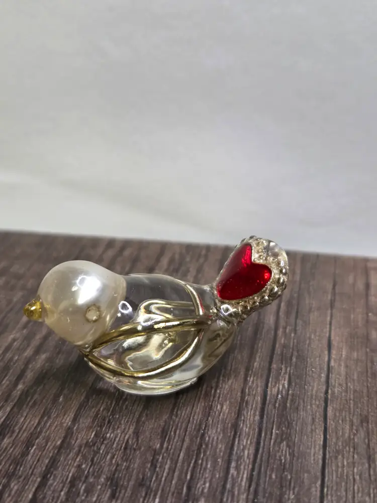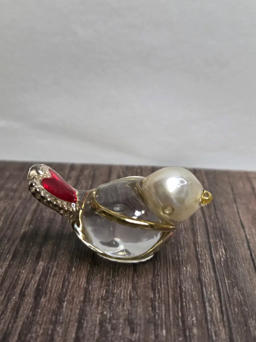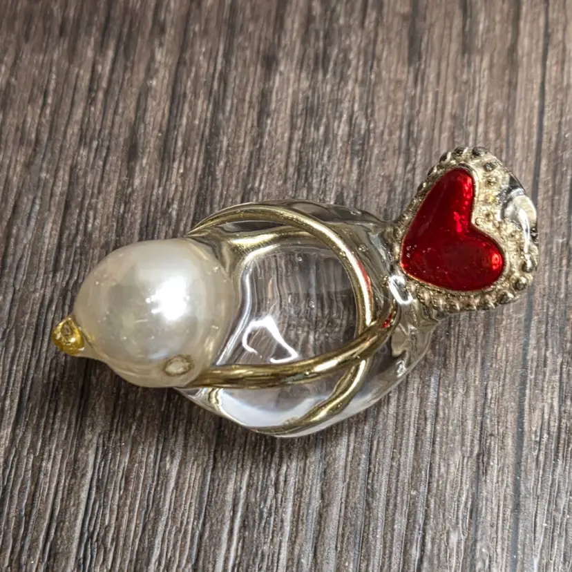 She has a gold seed bead beak, a faux pearl upcycled from a necklace, a heart charm tailfeather and two entwined rings for the body.