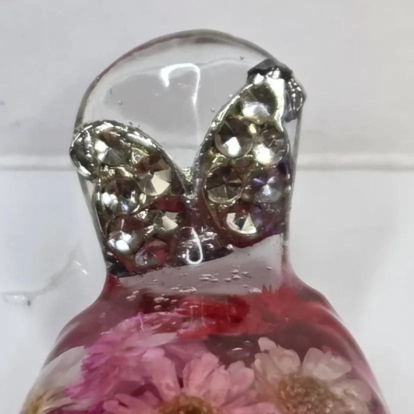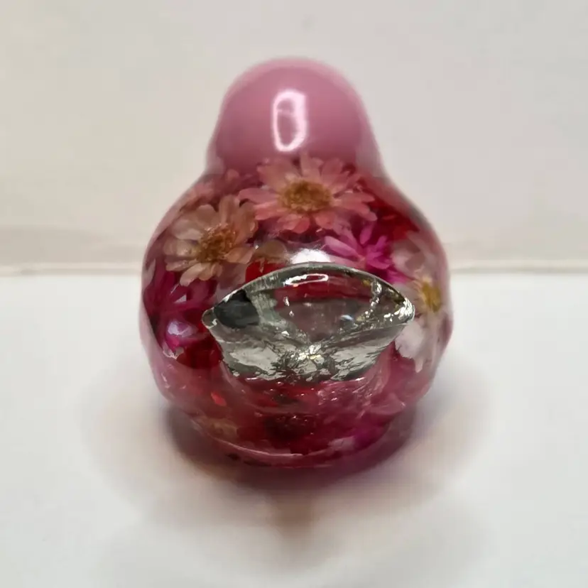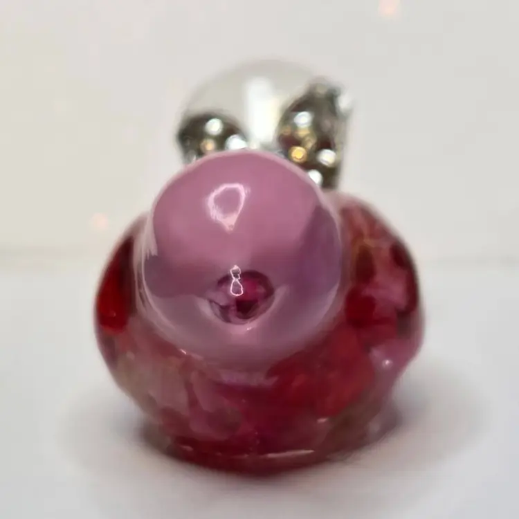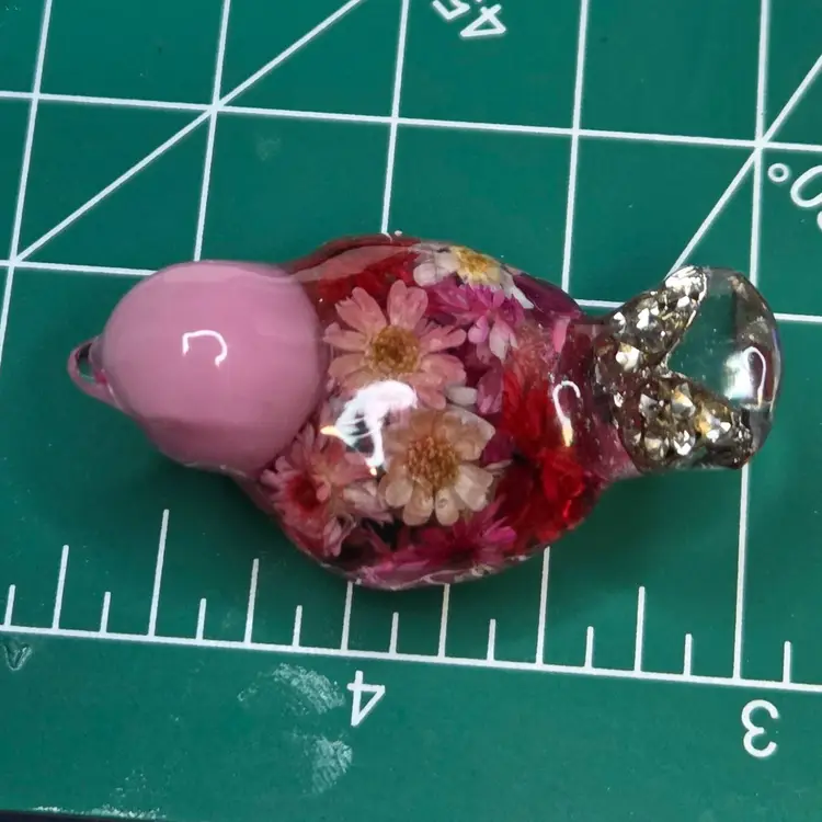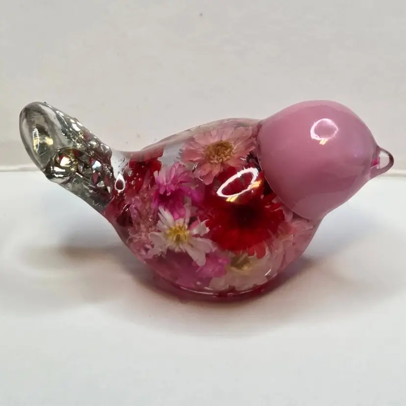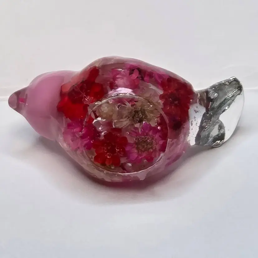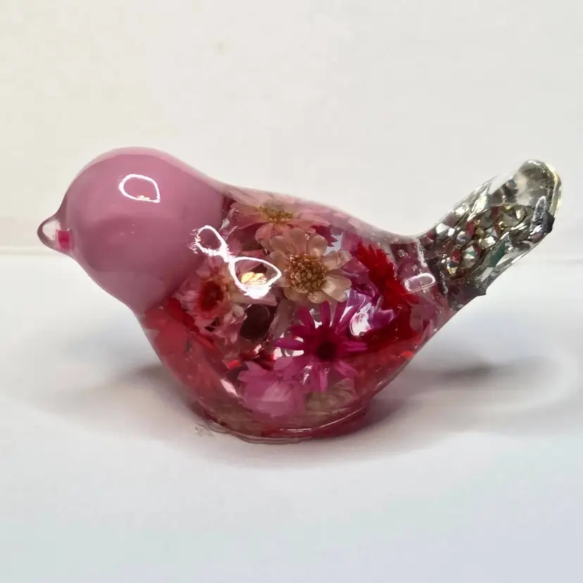 These tiny little birds are handmade from UV resin and bits of baubles and bling from my craft jewelry pile or whatever else I can throw in. No two are alike.