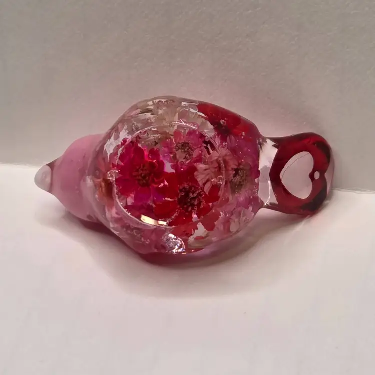 This gal is made with a white seed bead beak, a pink bead from a necklace, her body has pinks, red and white flowers that won't ever wilt and her tail feather is made with a heart sequin.