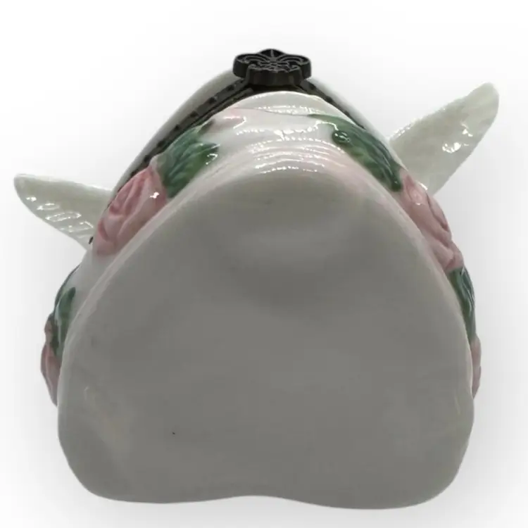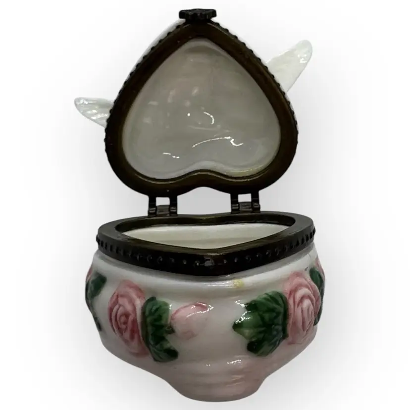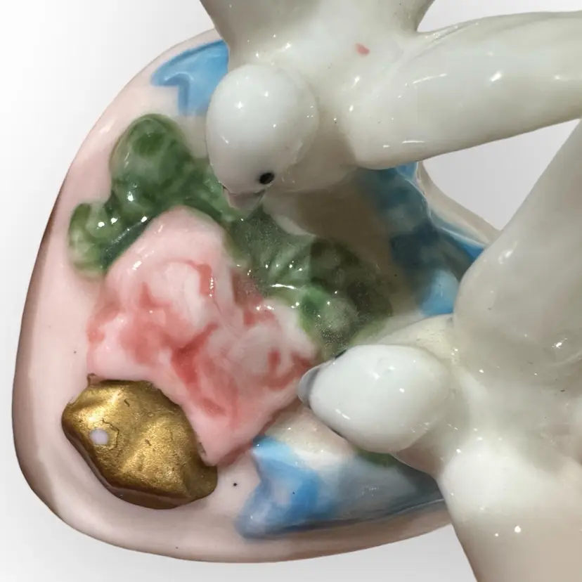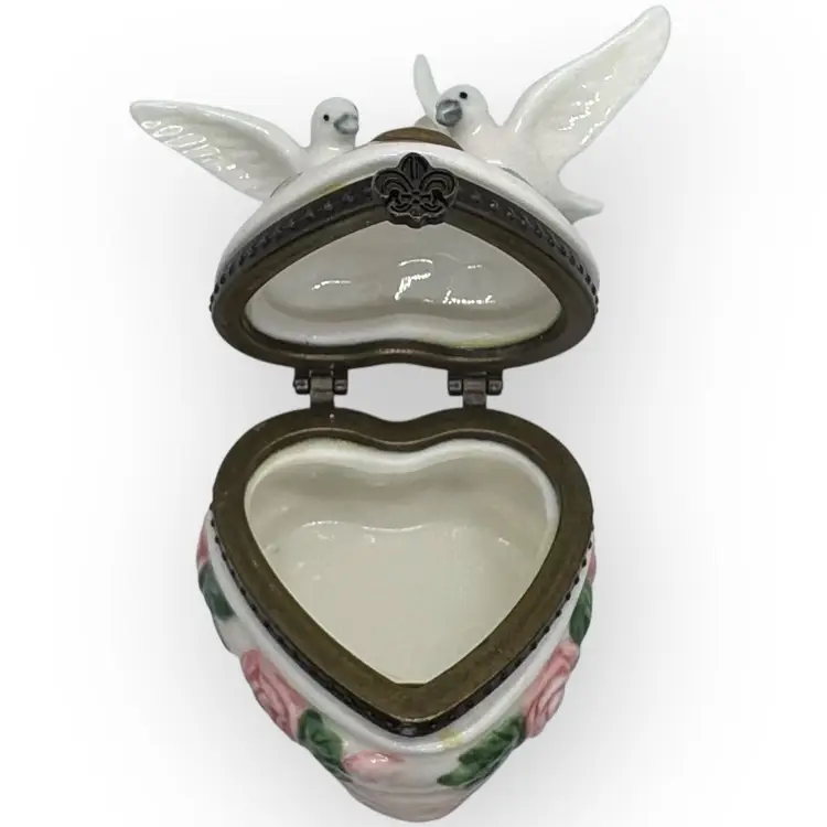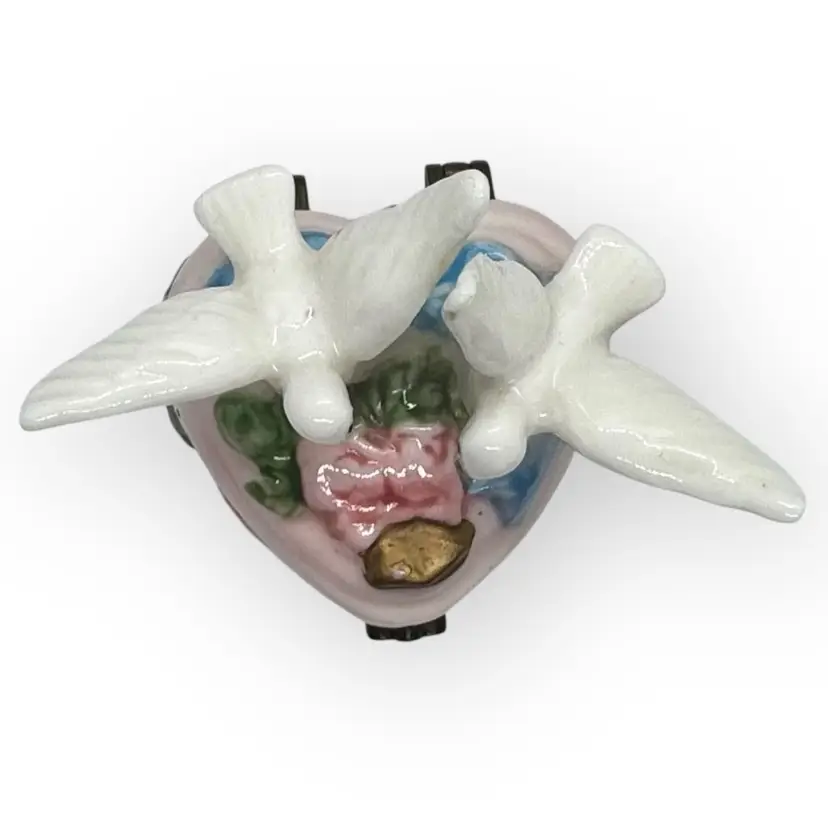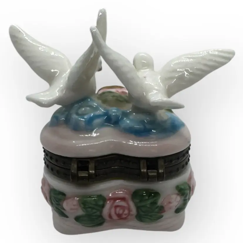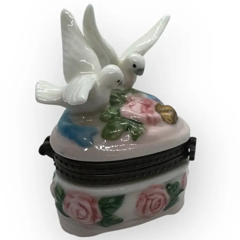 Beautiful porcelain footed hinged trinket box in excellent vintage condition with no chips, cracks, or crazing. One of the doves does have a pinkish dot on his back which appears to be glazed in. There is also a tiny chip in the gold paint on the top near the rosebud. Can barely be seen; both flaws are depicted in last photo. Hinge is metal with a fleur-dis-lis closure that has a very slight snap to close and not hard to open, and top stays open by itself. Measures 3” across from wingtip to wingtip, 2-1/2” inches front to back including hinges and 3-1/4” tall from bottom of foot to tip of wing.