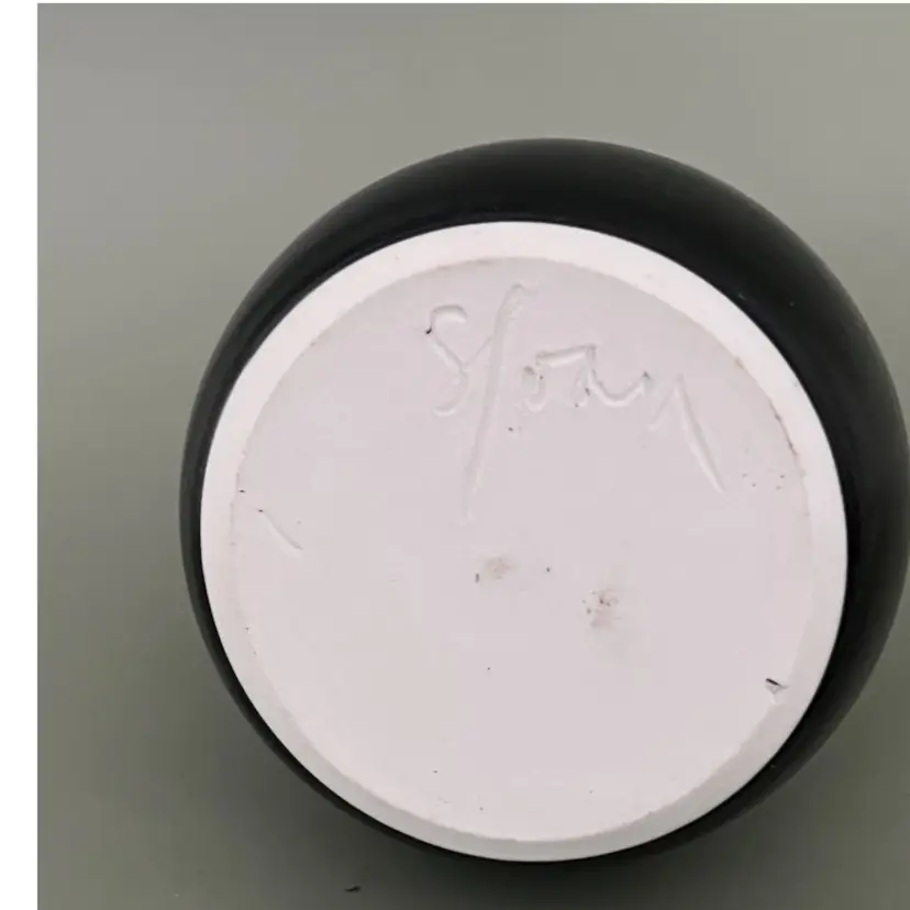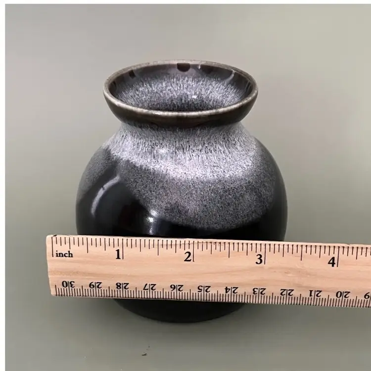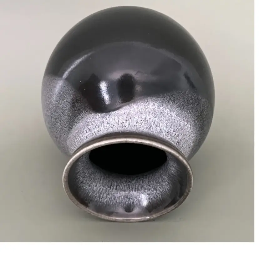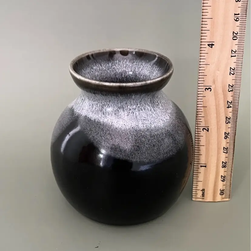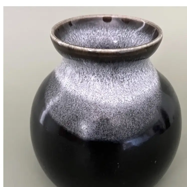 Dramatic vase is handmade from white clay and signed by the artist. This vase features a distinctive dark glaze on the bottom, transitioning to a lighter, textured glaze towards the top. The shape is a rounded body with a narrow neck and a slightly flared rim. It is a modern piece perfect for minimalist decor-- clean lines and strong statement.