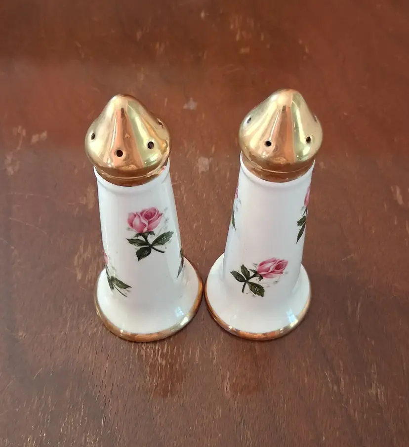 Add a touch of vintage charm to your table with this lovely set of KASS USA salt and pepper shakers. The set includes two shakers, one for salt and one for pepper, each featuring a beautiful pink rose pattern and elegant gold trim, measuring 4.75" tall. Spice up your meals with this delightful set, perfect for any occasion.