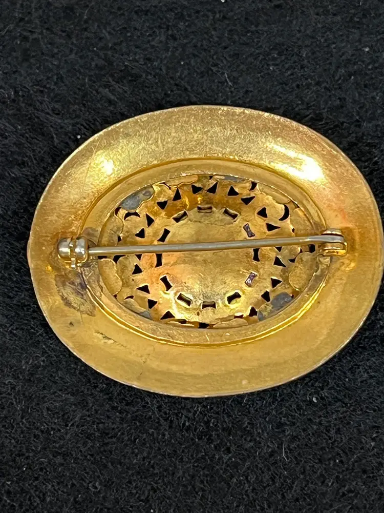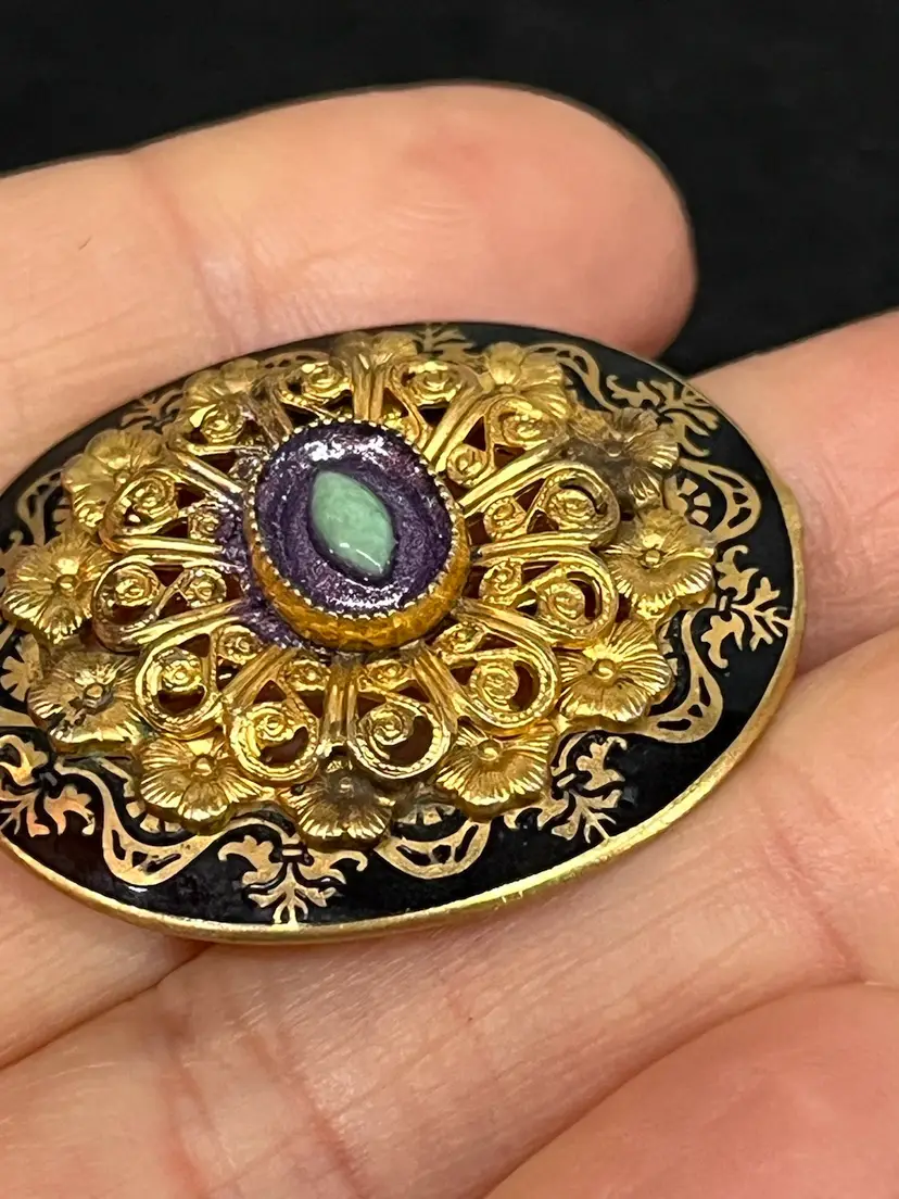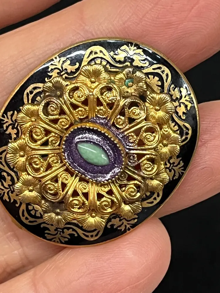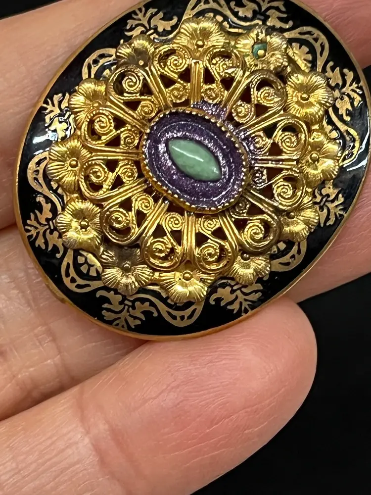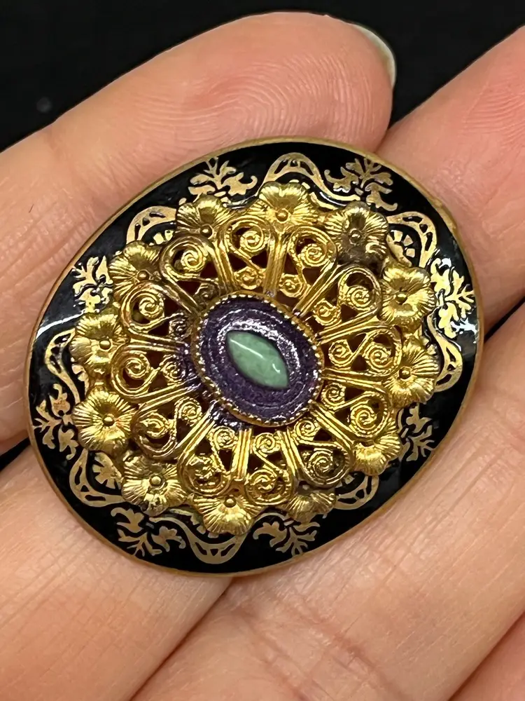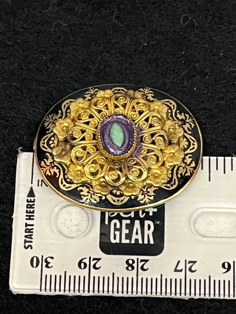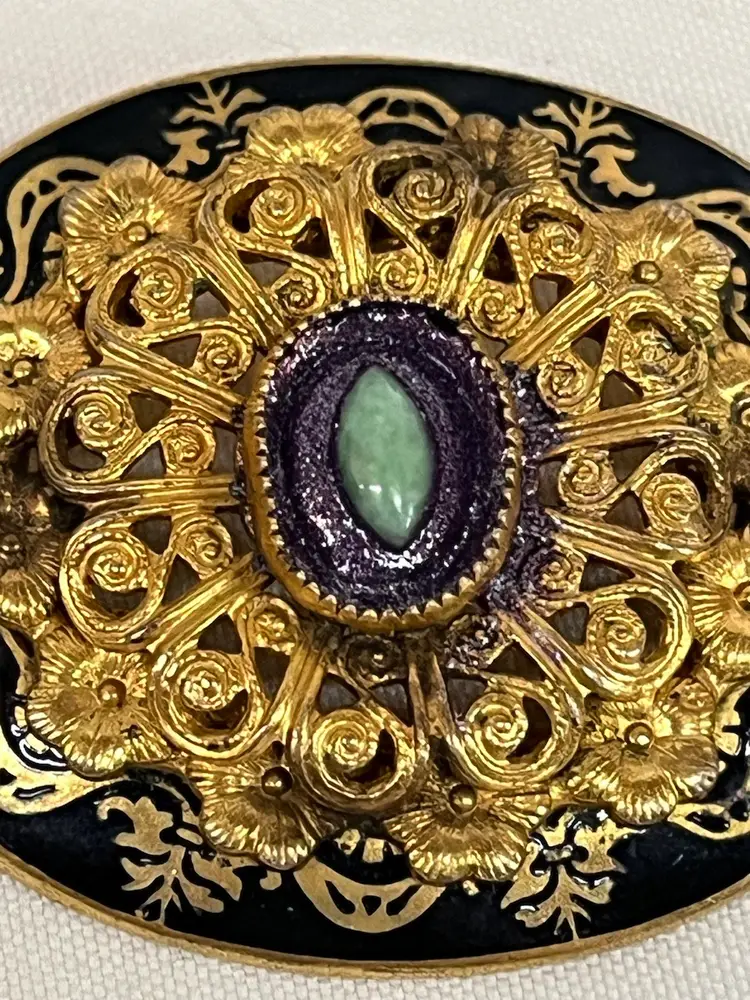 This lovely brooch has a faux jade Center stone and lovely filigree accents measures almost 1.5”