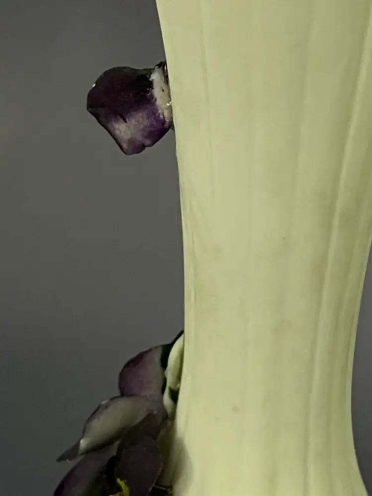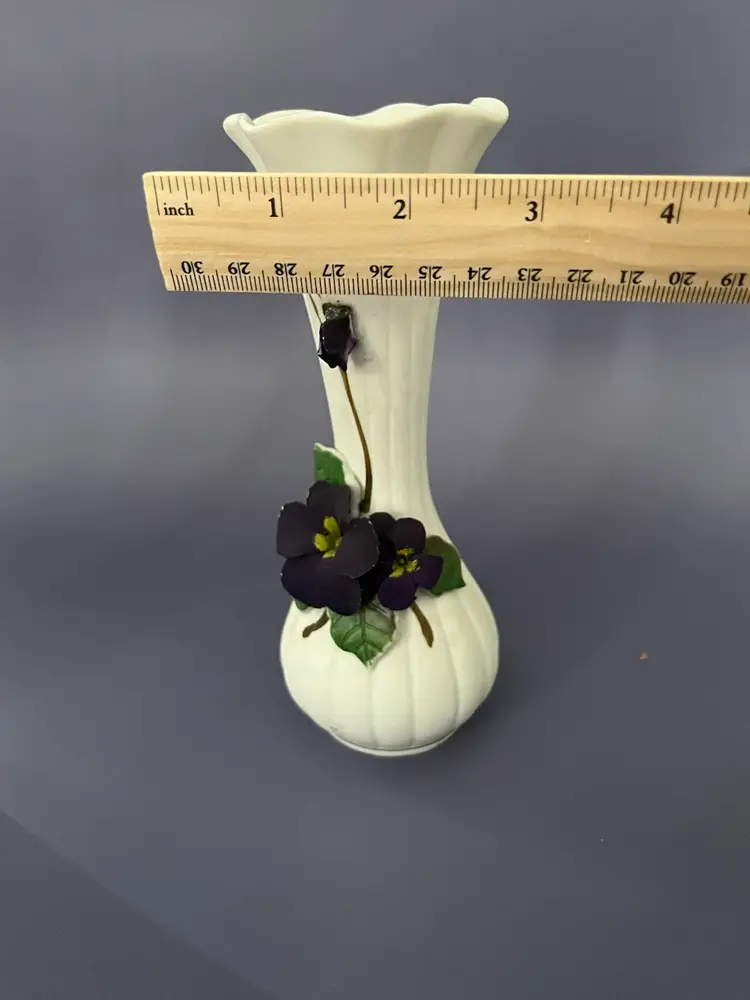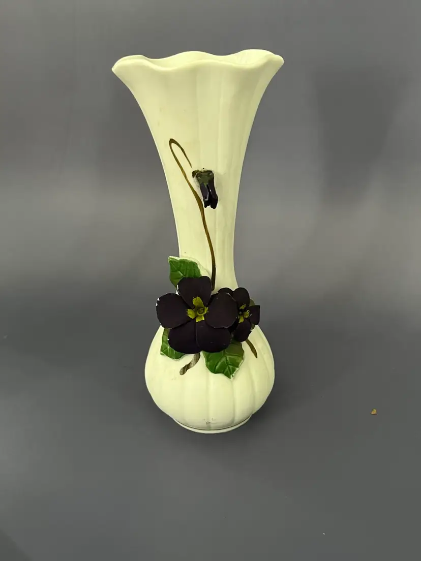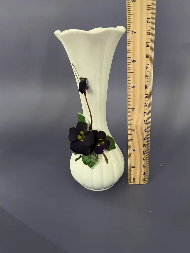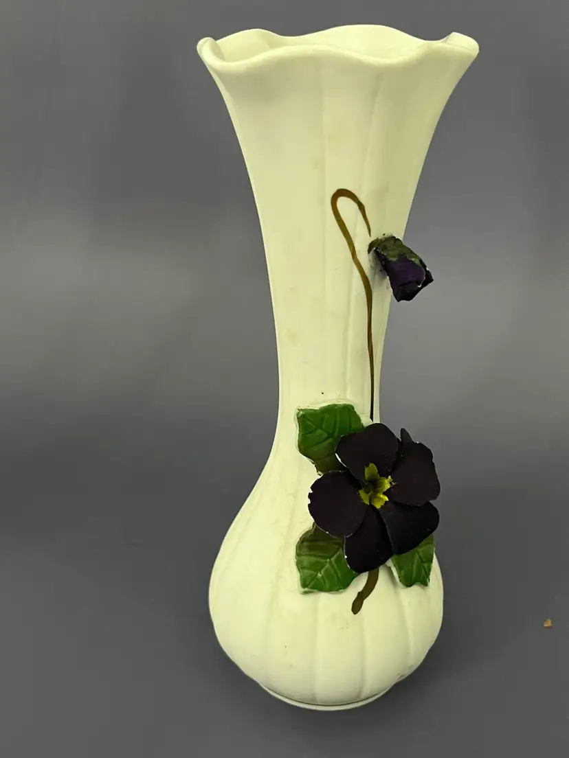 This beautiful vintage vase is perfect in both size and color. It carries the Japan hallmark dating it between 1921 and 1941. The attention to detail of this time period is evident in this piece. I would call this flower a deep purple clematis with its characteristic vine and delicate bud. The vase itself has a scalloped top with curved defined ridges running its 7 inch height. It will be a bear to wrap and ship, but for you, nothing is too much.