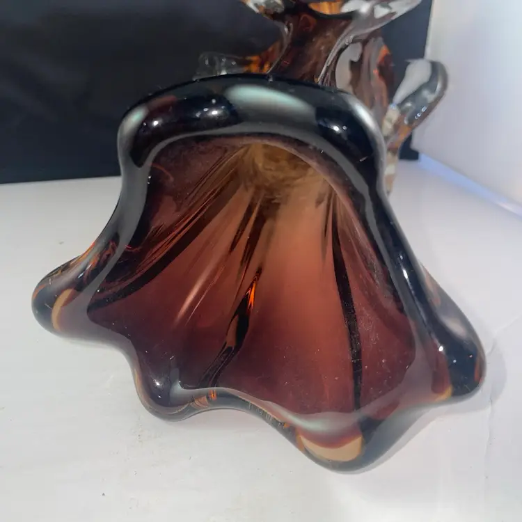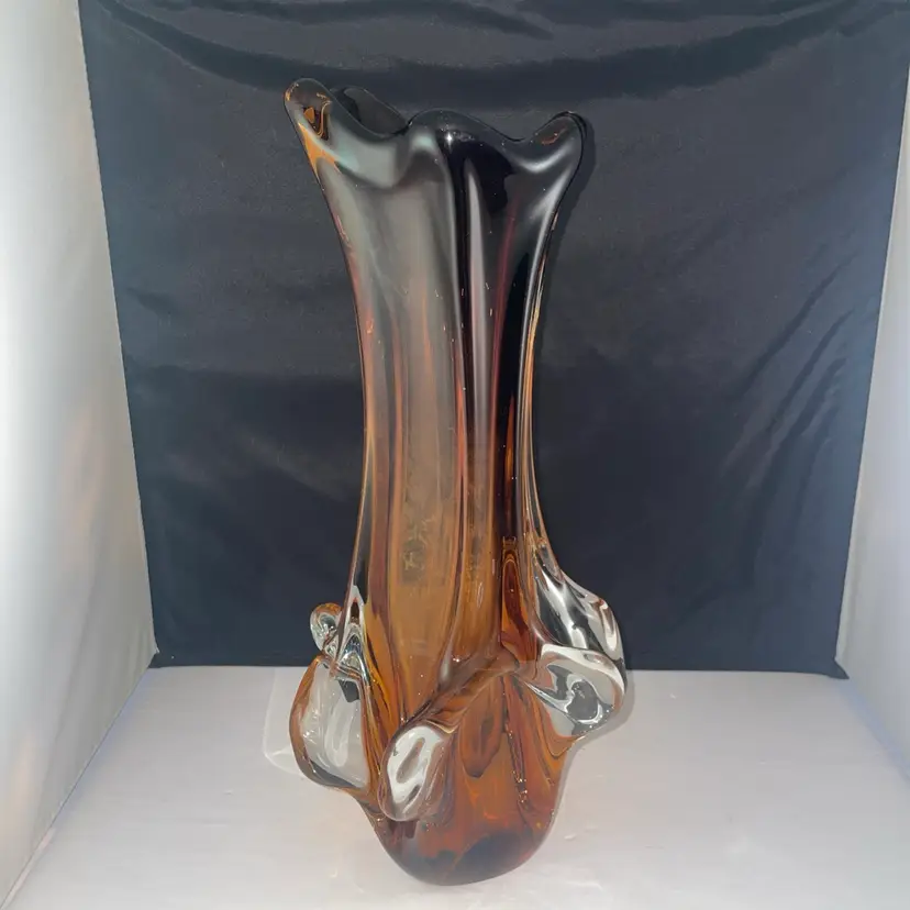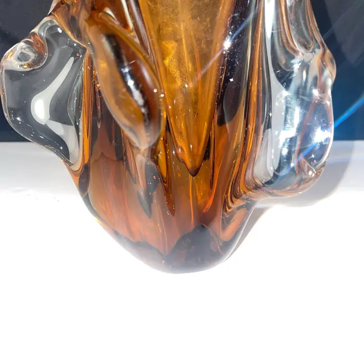 This vintage MCM art glass ribbed tri-corner 13" vase in amber brown features a unique design that is characteristic of Murano glass production. The hand-blown glass vase exudes a retro charm with its classic tri-corner shape and vibrant ribbed pattern, making it a striking addition to any home decor collection. The unmarked brand adds to its air of mystery and allure, perfect for collectors of artisan glass pieces.