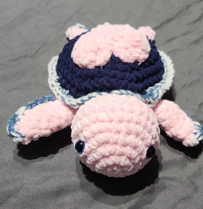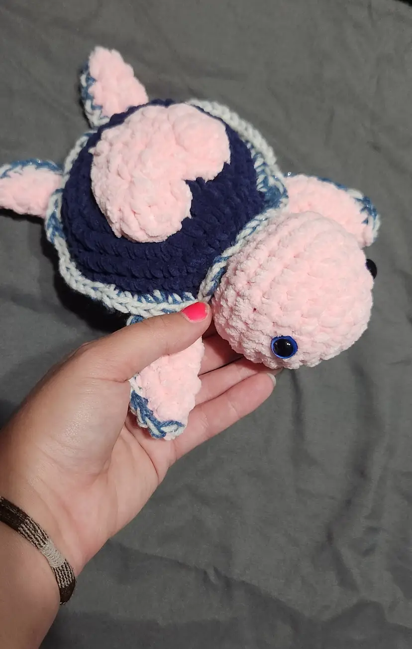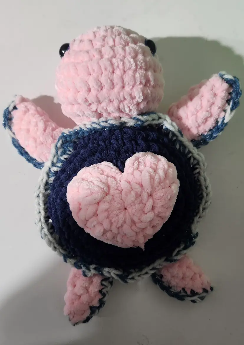 This turtle shows lots of love to someone special in your life. It makes a great gift! Safety eyes, fiber fill and chenille yarn and cotton yarn. Made with love.