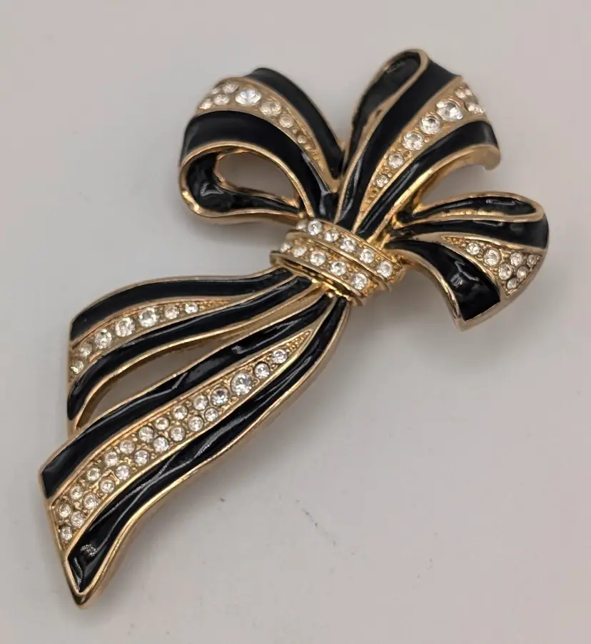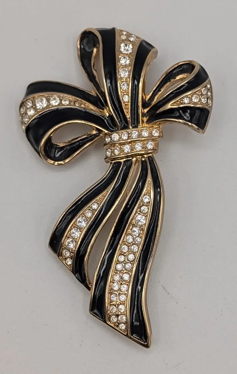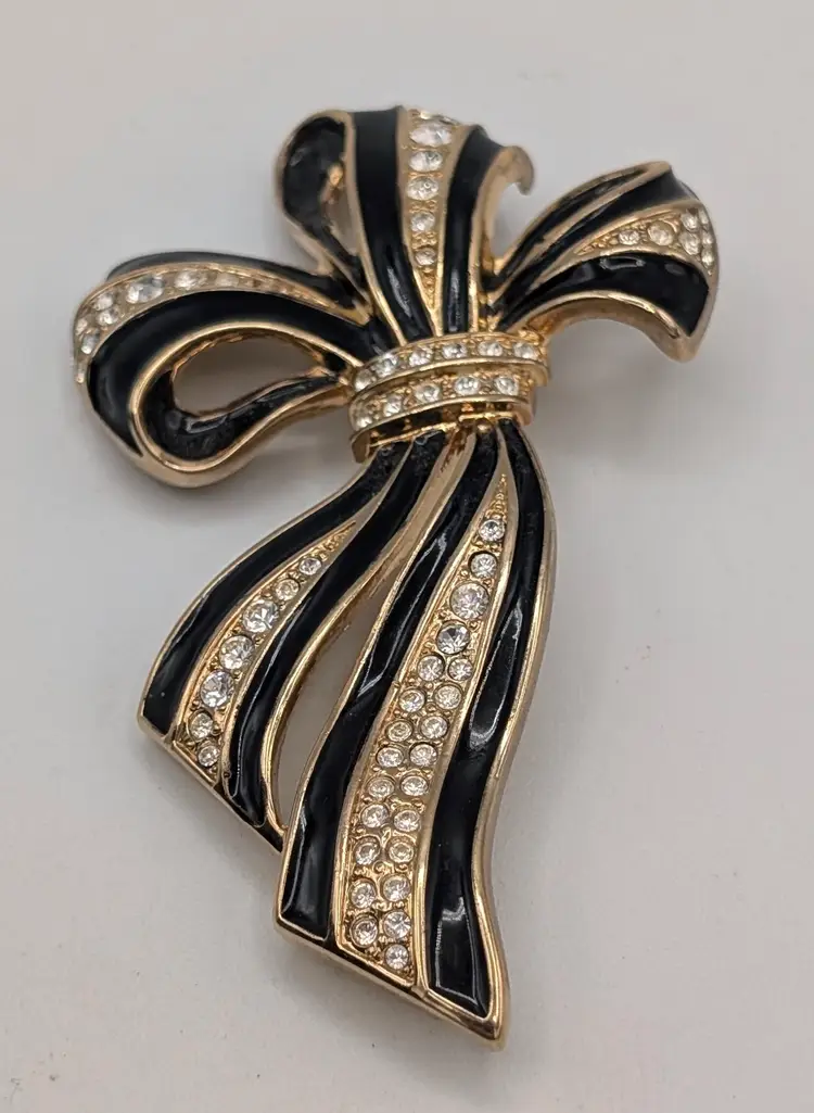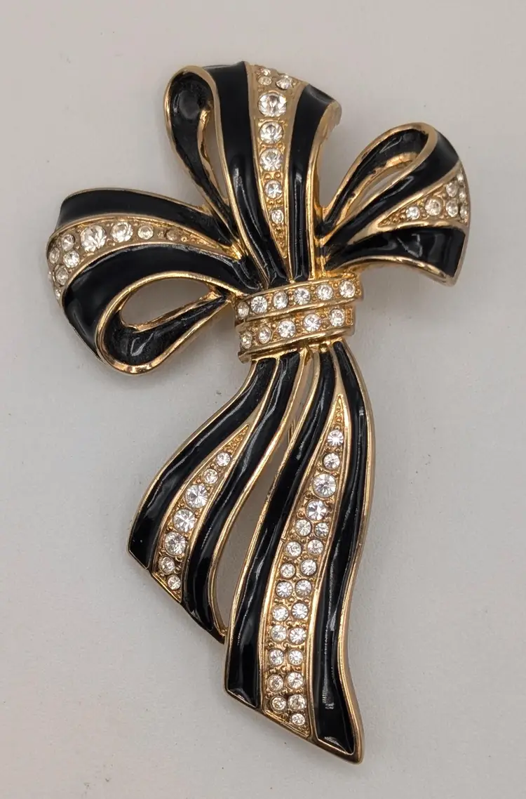 Elegant vintage brooch featuring a black enamel over gold tone metal bow adorned with sparkling rhinestones. Perfect for adding a touch of glamour to any outfit. Excellent condition with no missing stones. Measures approximately 3 inches in length and 2 inches width. Signed with cursive LR mark. A timeless accessory for any jewelry collection.