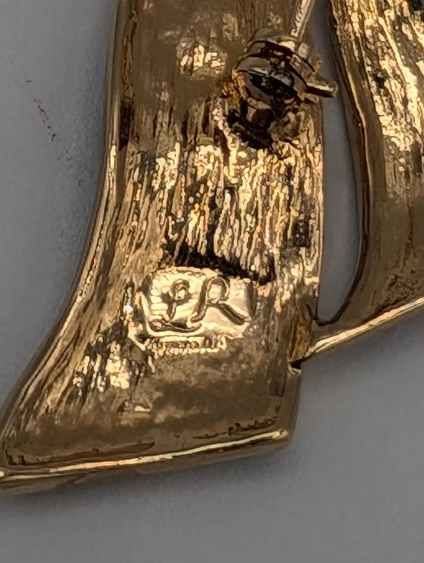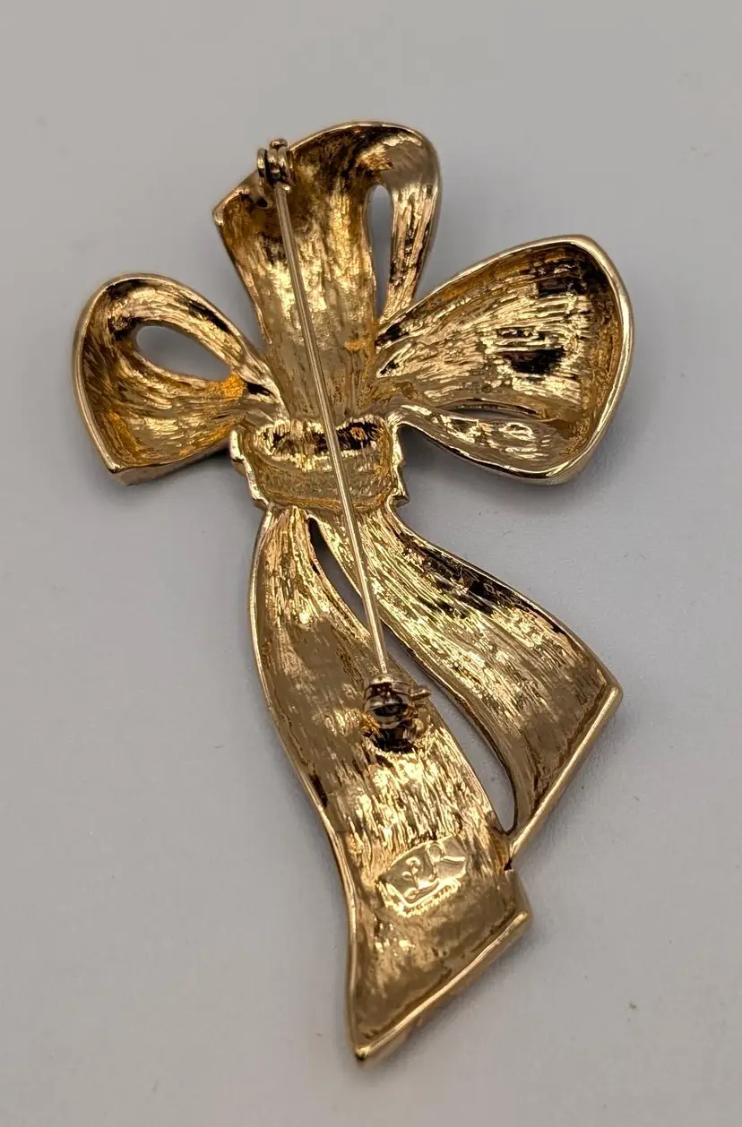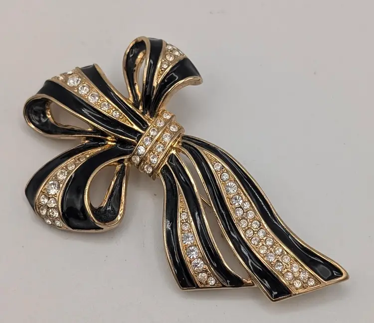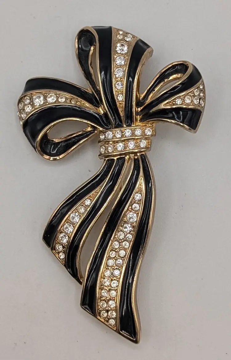Elegant vintage brooch featuring a black enamel over gold tone metal bow adorned with sparkling rhinestones. Perfect for adding a touch of glamour to any outfit. Excellent condition with no missing stones. Measures approximately 3 inches in length and 2 inches width. Signed with cursive LR mark. A timeless accessory for any jewelry collection.