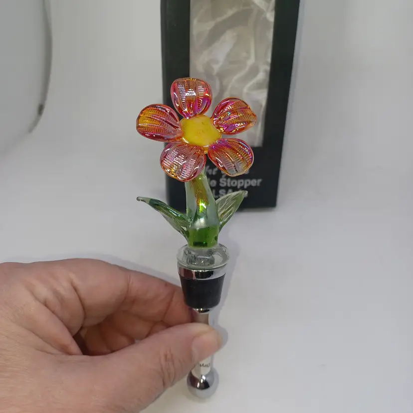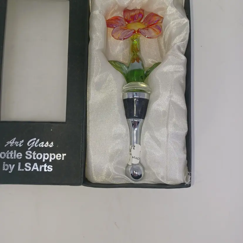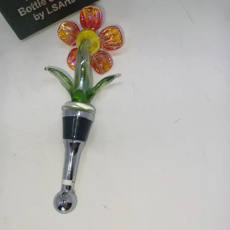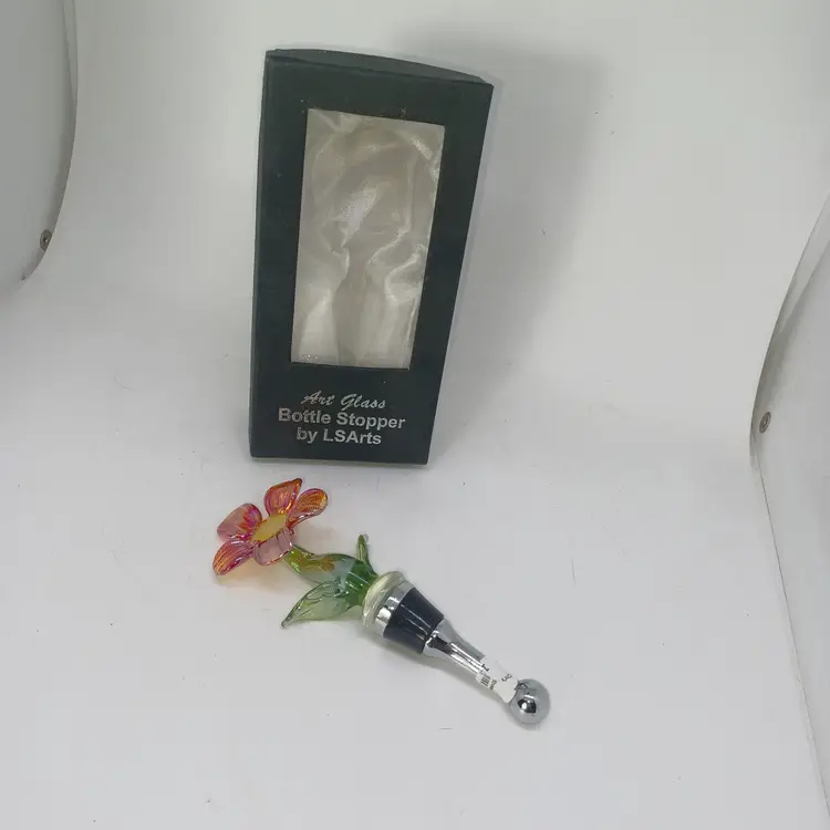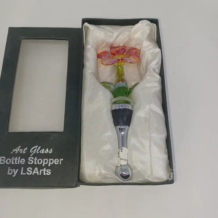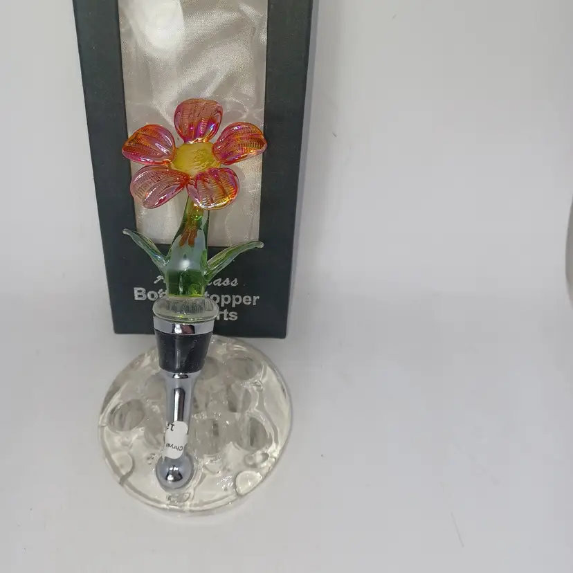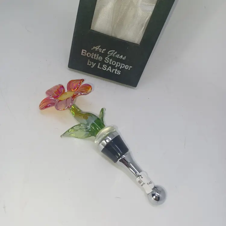 LSArts Art Glass Pink Flower Bottle Topper Stopper Metal 5 1/4" T x 1 7/8" W NIB Please see all pictures as they are the best description all items from a smoke-free home with pets experienced fragile shipper
