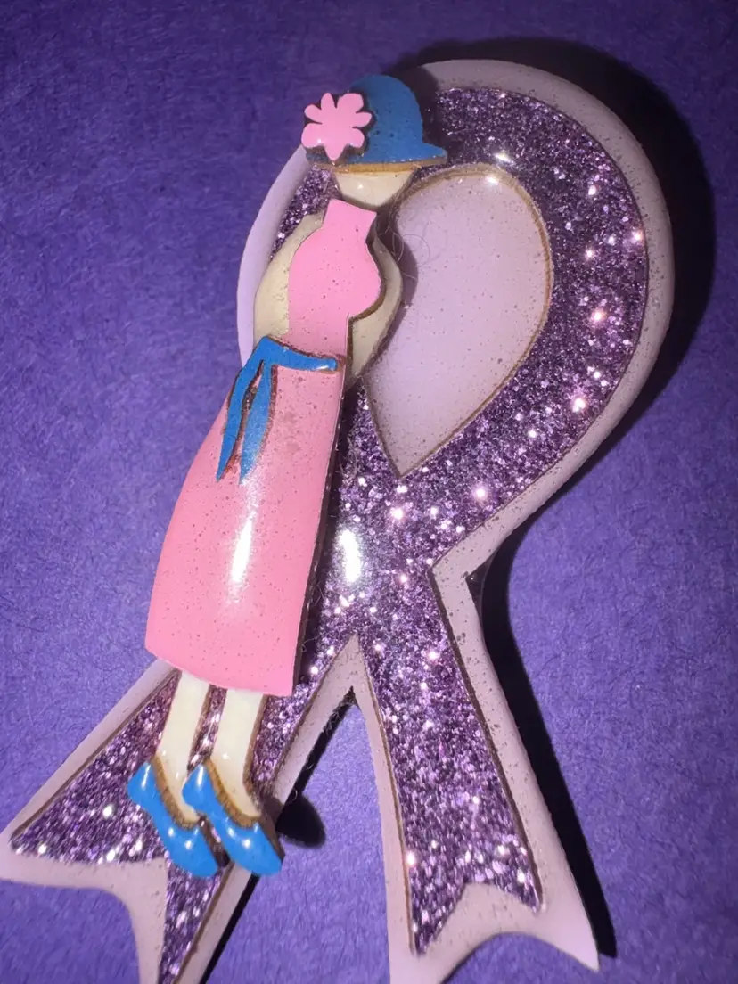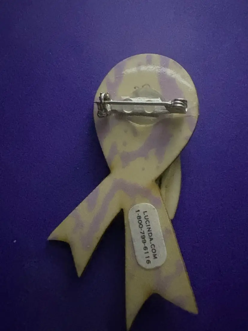 The purple ribbon is most commonly used to raise awareness for pancreatic cancer. It is also used for awareness for animal abuse, Alzheimer's disease, domestic violence, epilepsy, lupus, sarcoidosis, and Crohn's disease. ‘Lucinda.com’ sticker on back.