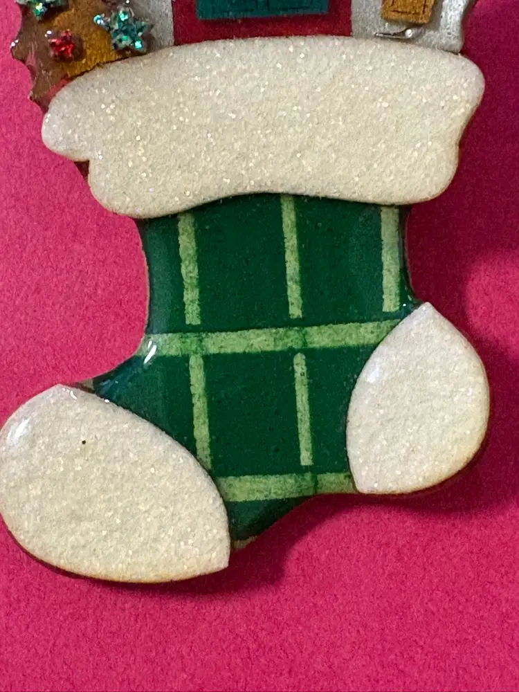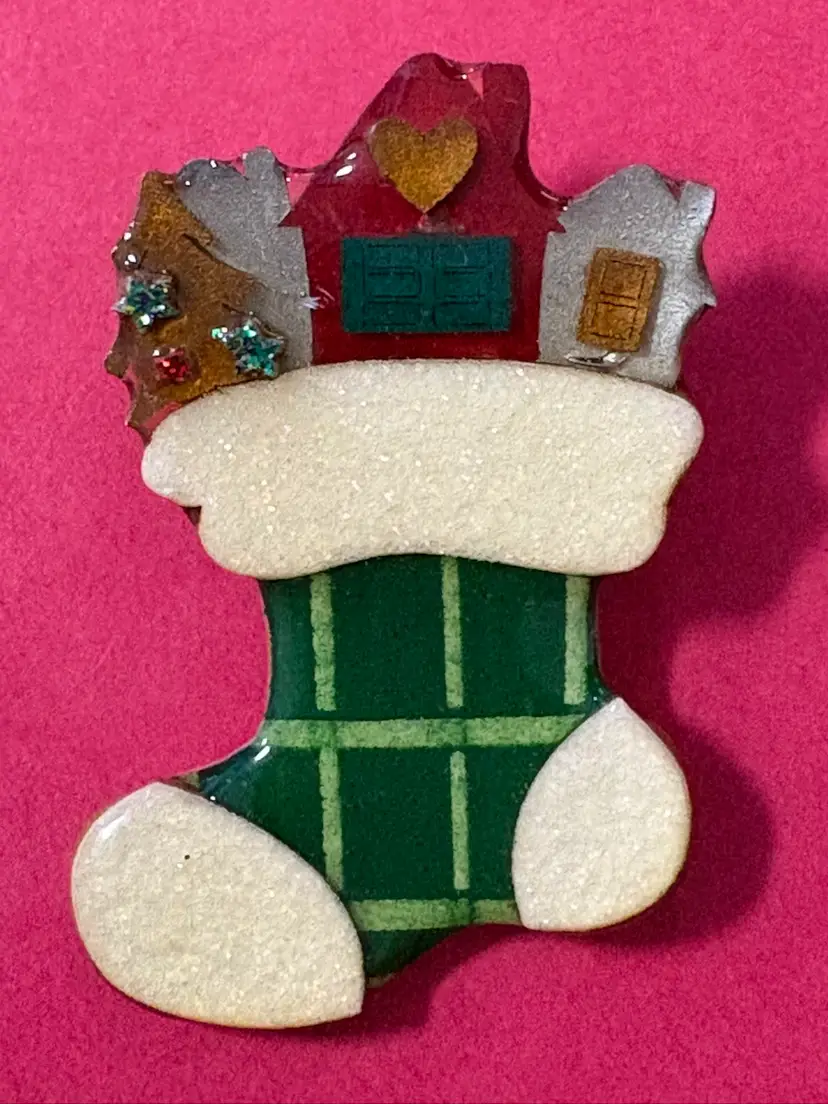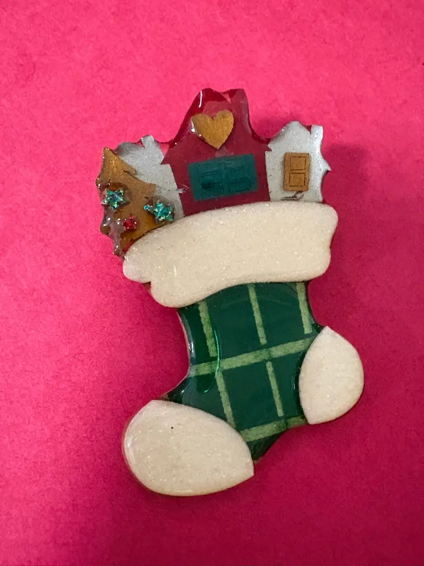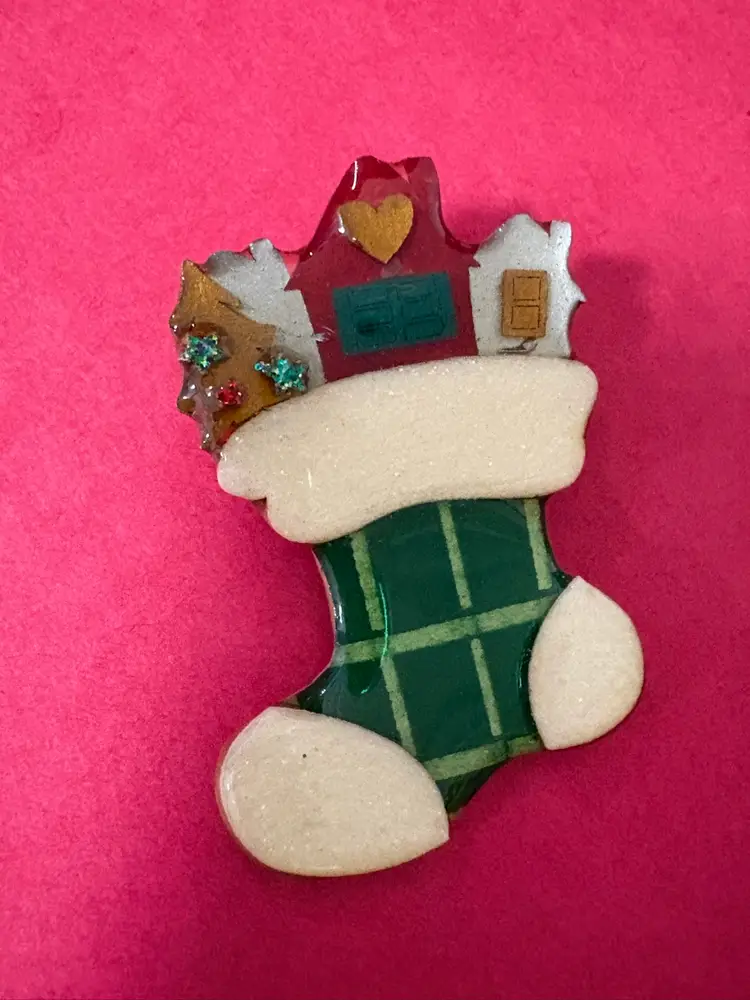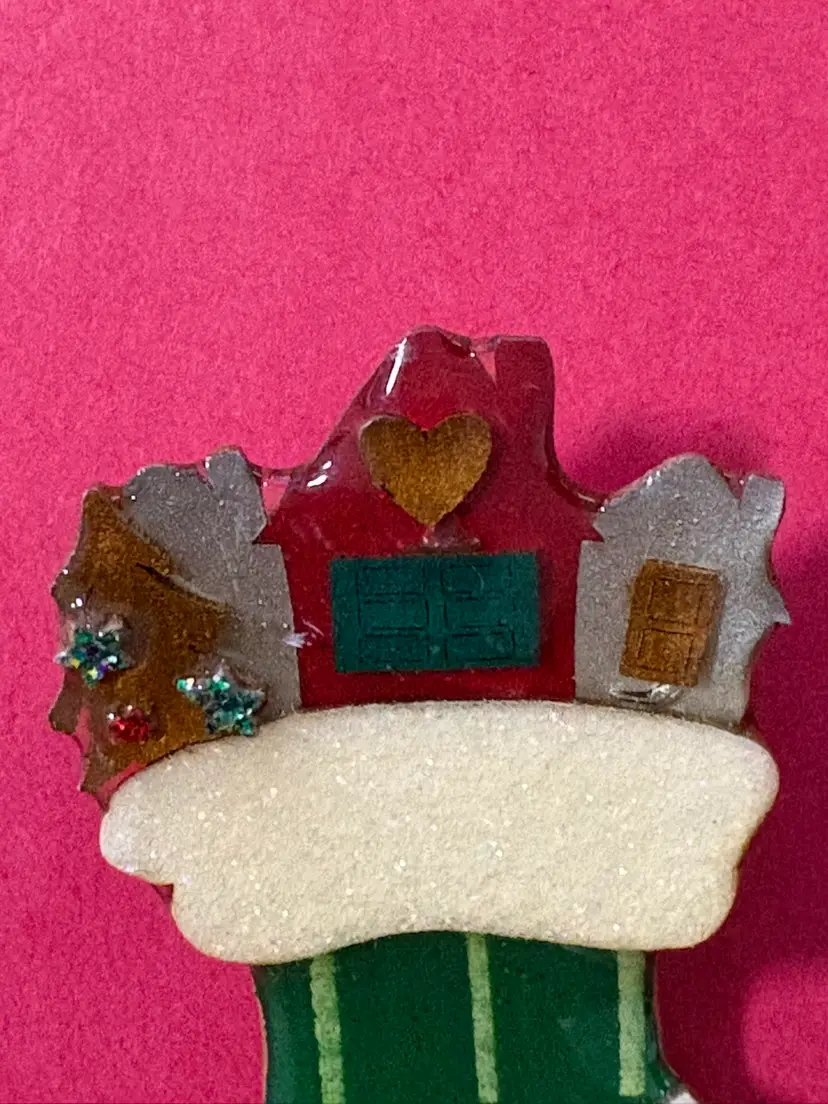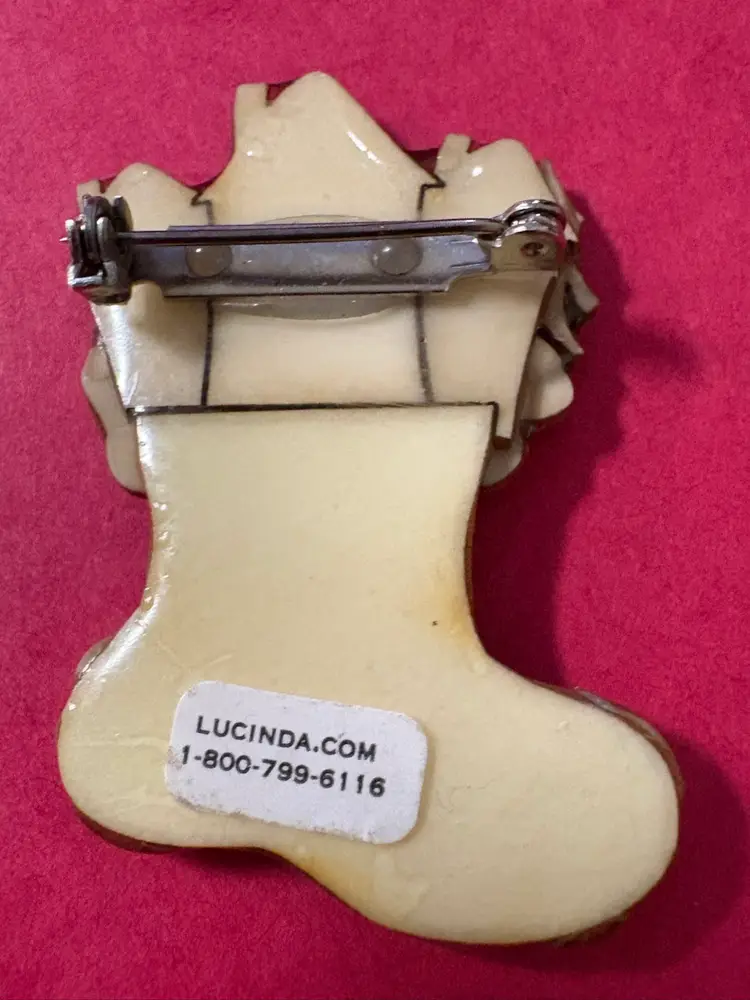 This FUN Christmas Pin by Lucinda is in the shape of a stocking. Its fur areas are cream colored and sparkle like snow! The stocking is green and cream checkered. This cute stocking has a red house peeking out of the top along with a gold Christmas tree and another silver house. Has a ‘Lucinda.com’ sticker on the back.