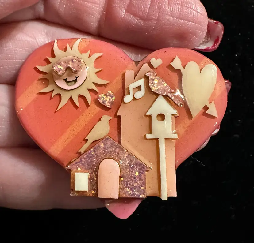 Fun Lucinda house pin with a Valentine theme. It is heart shaped with sun, birds and birdhouse. It is 1.75” x 2”. It is in very good condition.