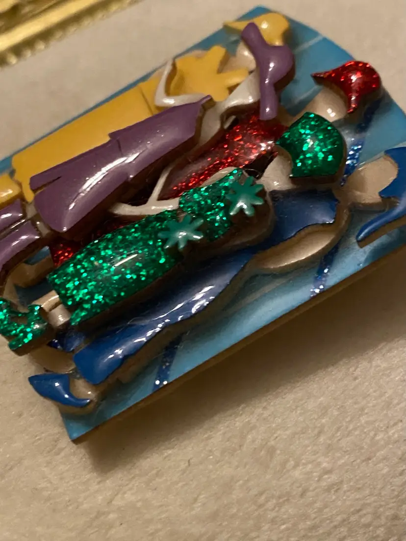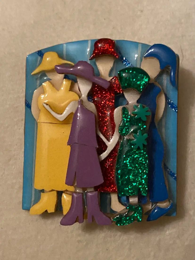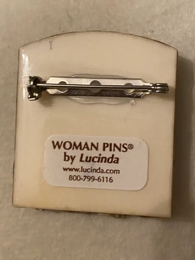 Condition: Very 3D dimensional and detailed right down to their shoes! Pin is in very good vintage condition. After her success with ‘House Pins’, Lucinda went on to create various other types of pins including people, women, book pins, pet pins, and several other pins. Includes “Woman Pins by Lucinda” sticker on back.