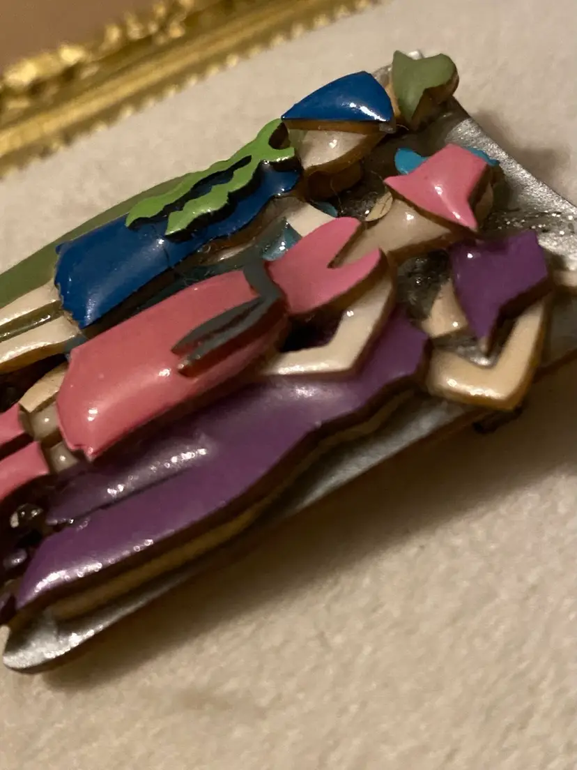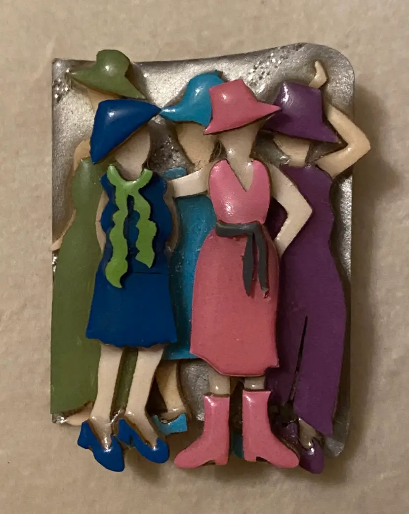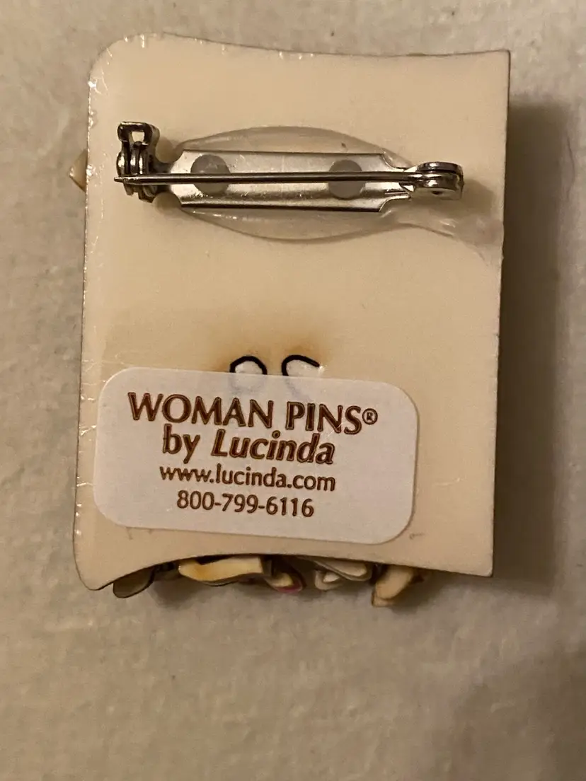 Condition: Very 3D dimensional and detailed right down to their shoes! Pin is in very good vintage condition. After her success with ‘House Pins’, Lucinda went on to create various other types of pins including people, women, book pins, pet pins, and several other pins. Includes “Woman Pins by Lucinda” sticker on back.