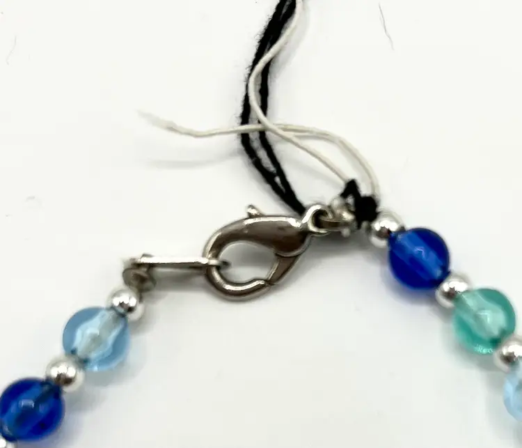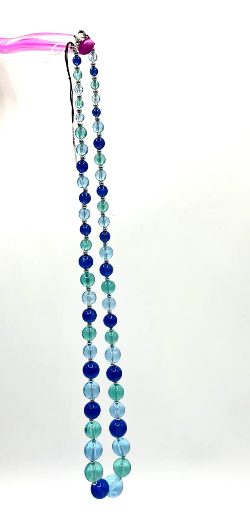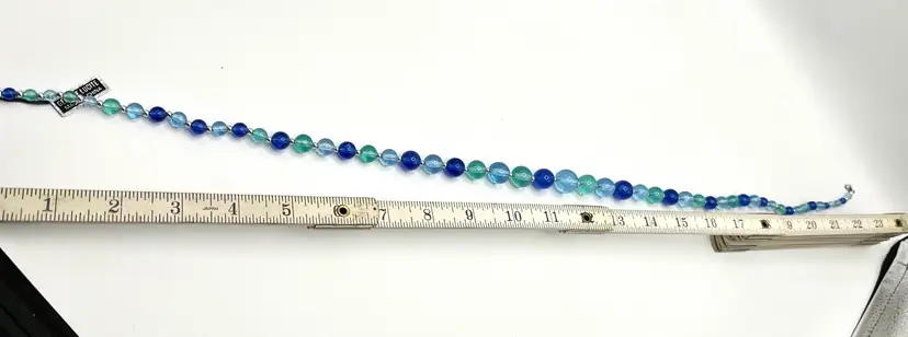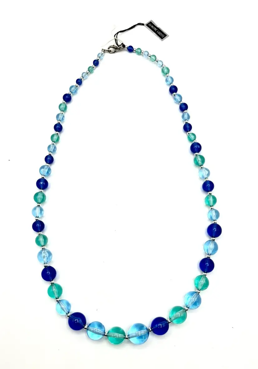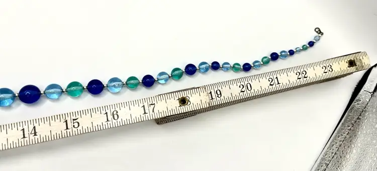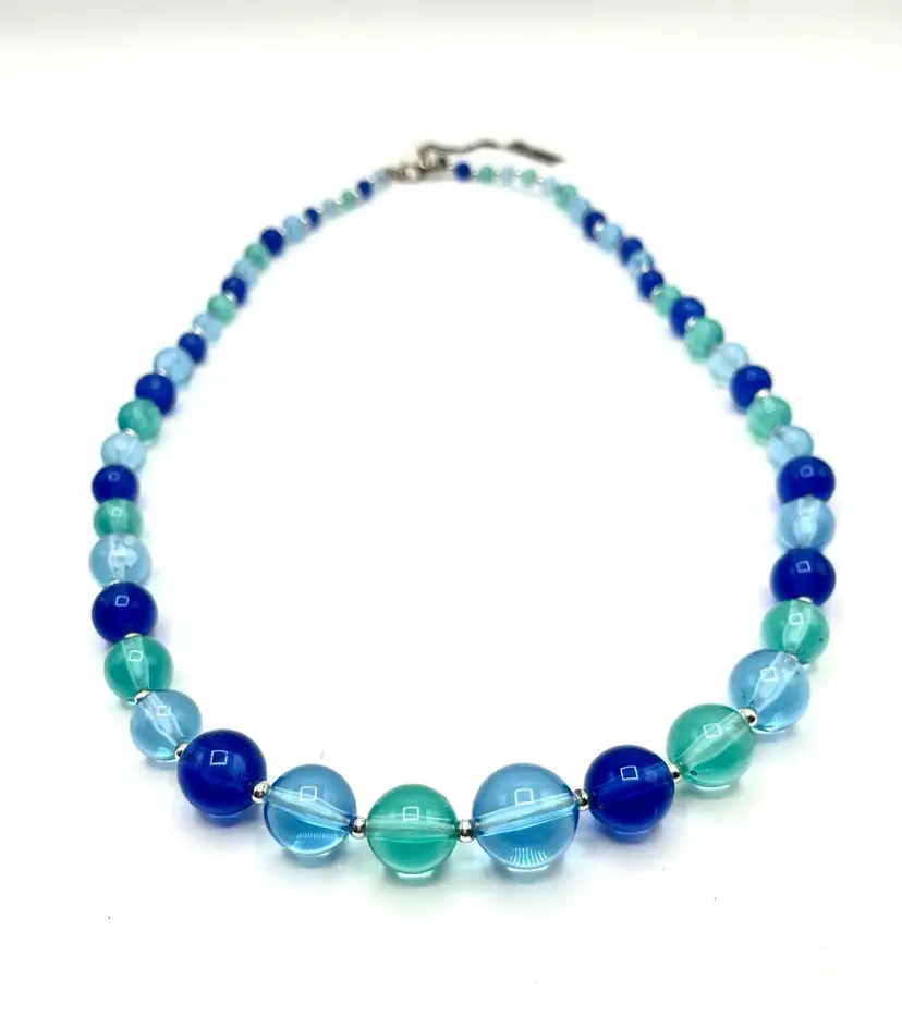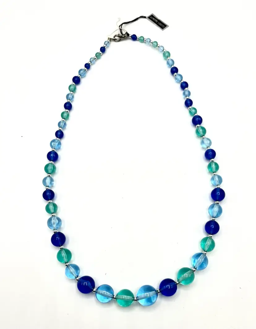 Very pretty piece in multiple shades of blue. 23 in long Silver tone clasp