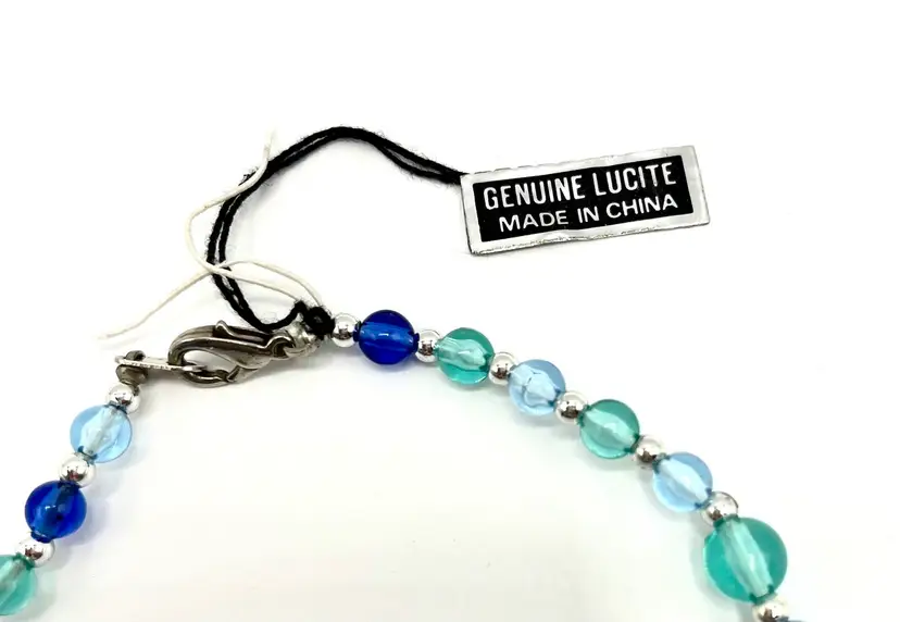 Bought this from a lady who had a bunch vintage costume jewelry. It has a tag stating genuine lucite. I would guess from the 90s. Made in China.