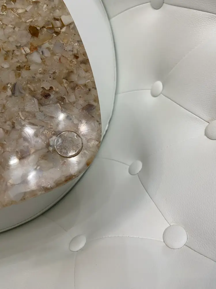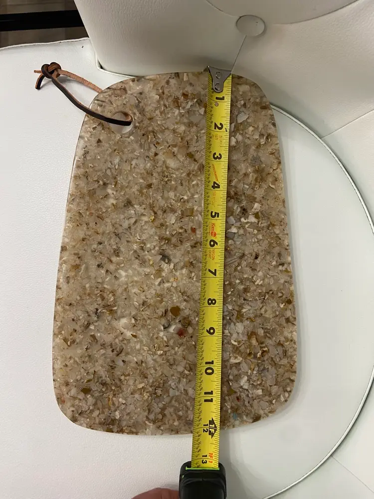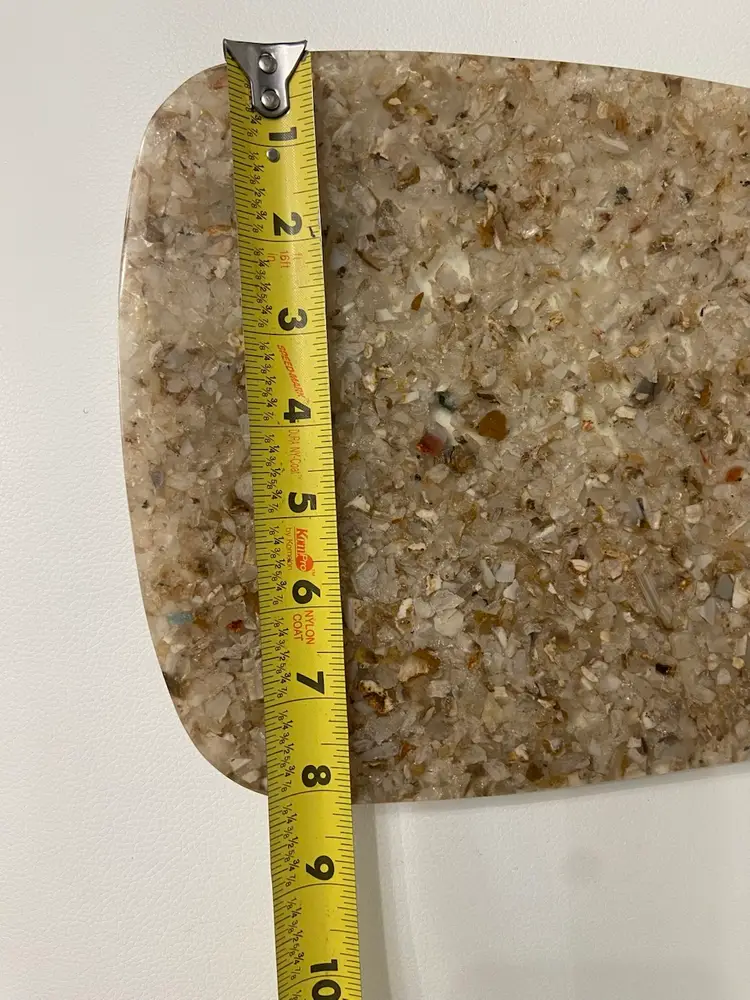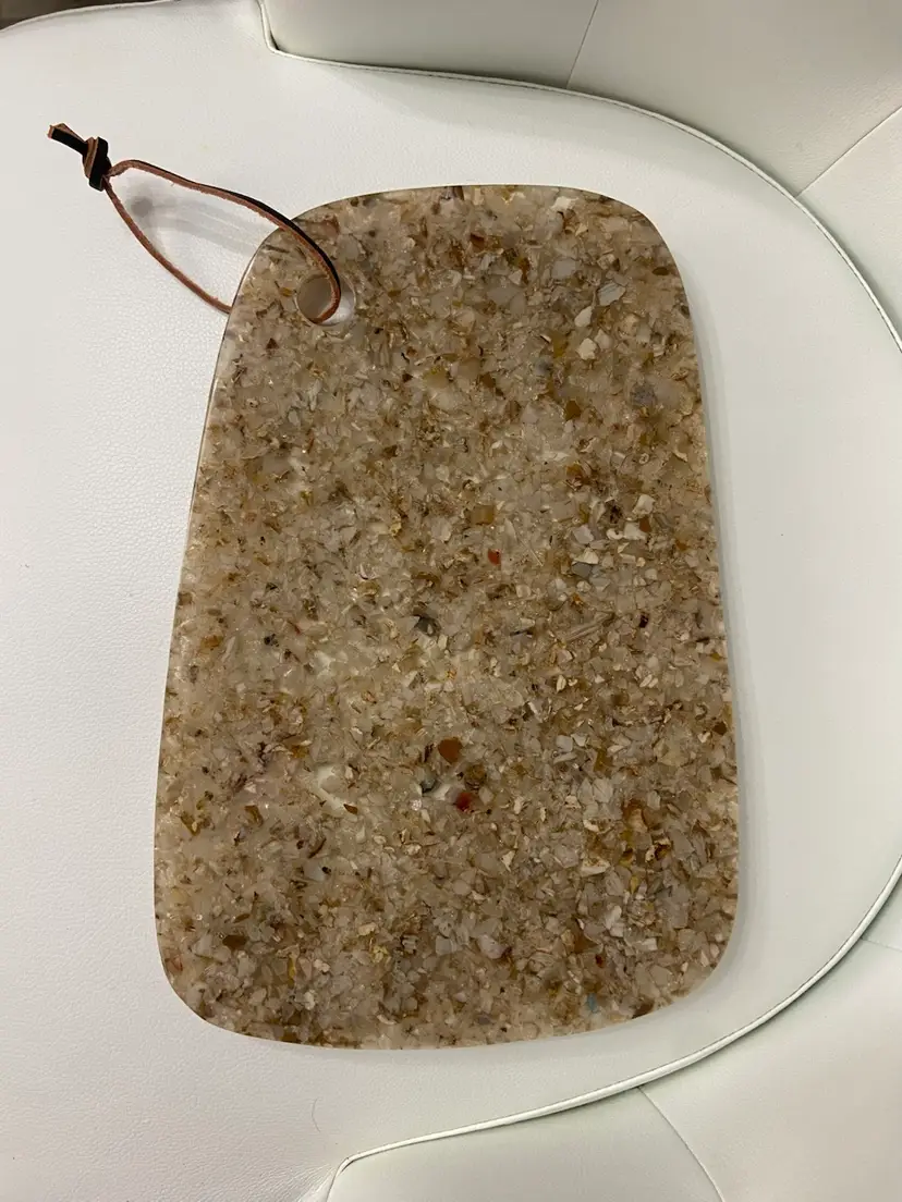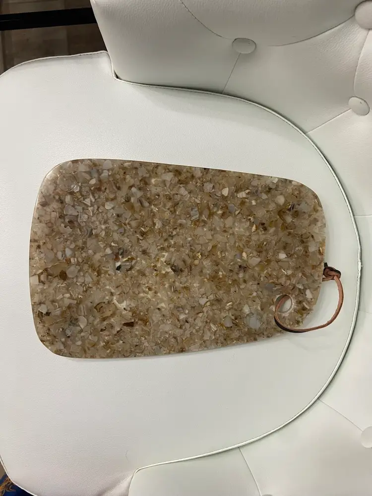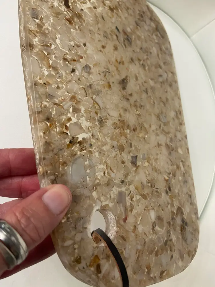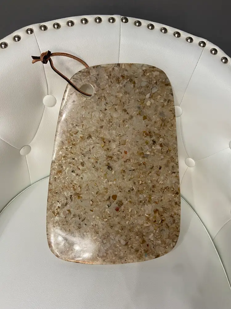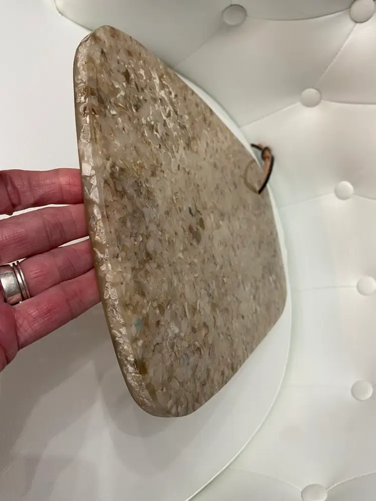 The resin Cheese Cutting Board, Retro 70’s Vibe is a vintage-inspired cheese board in a small oblong shape, featuring a brown tan speckled acrylic material with an all-over retro 70’s pattern. It comes with non-slip rubber pads and a leather hanging strap for easy storage and use. This stylish and unique cutting board by Bloomingville adds a touch of retro charm to any kitchen or dining area.