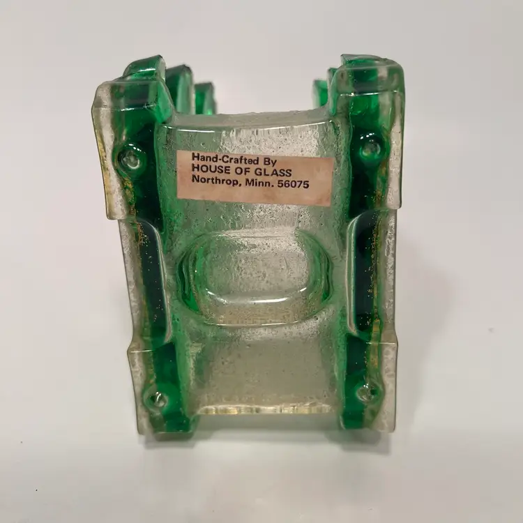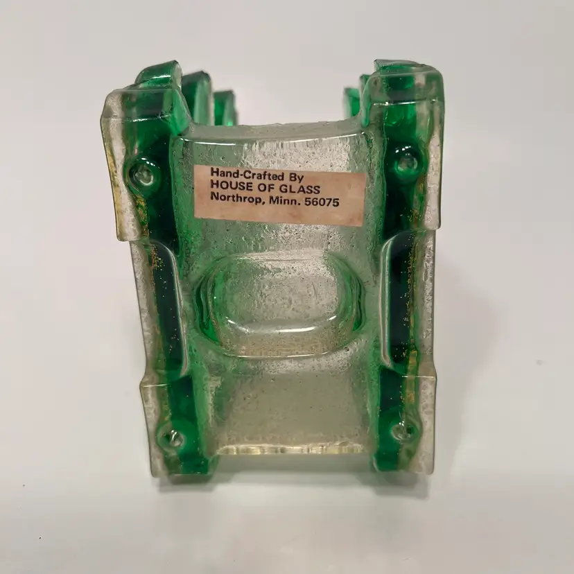 This Lucite Christmas tree napkin holder was made by House of Glass in Northrop, MN and is a great example of a classic lucite piece. The gold accent glitter on the green lucite makes for a wonderfully festive look to the piece.