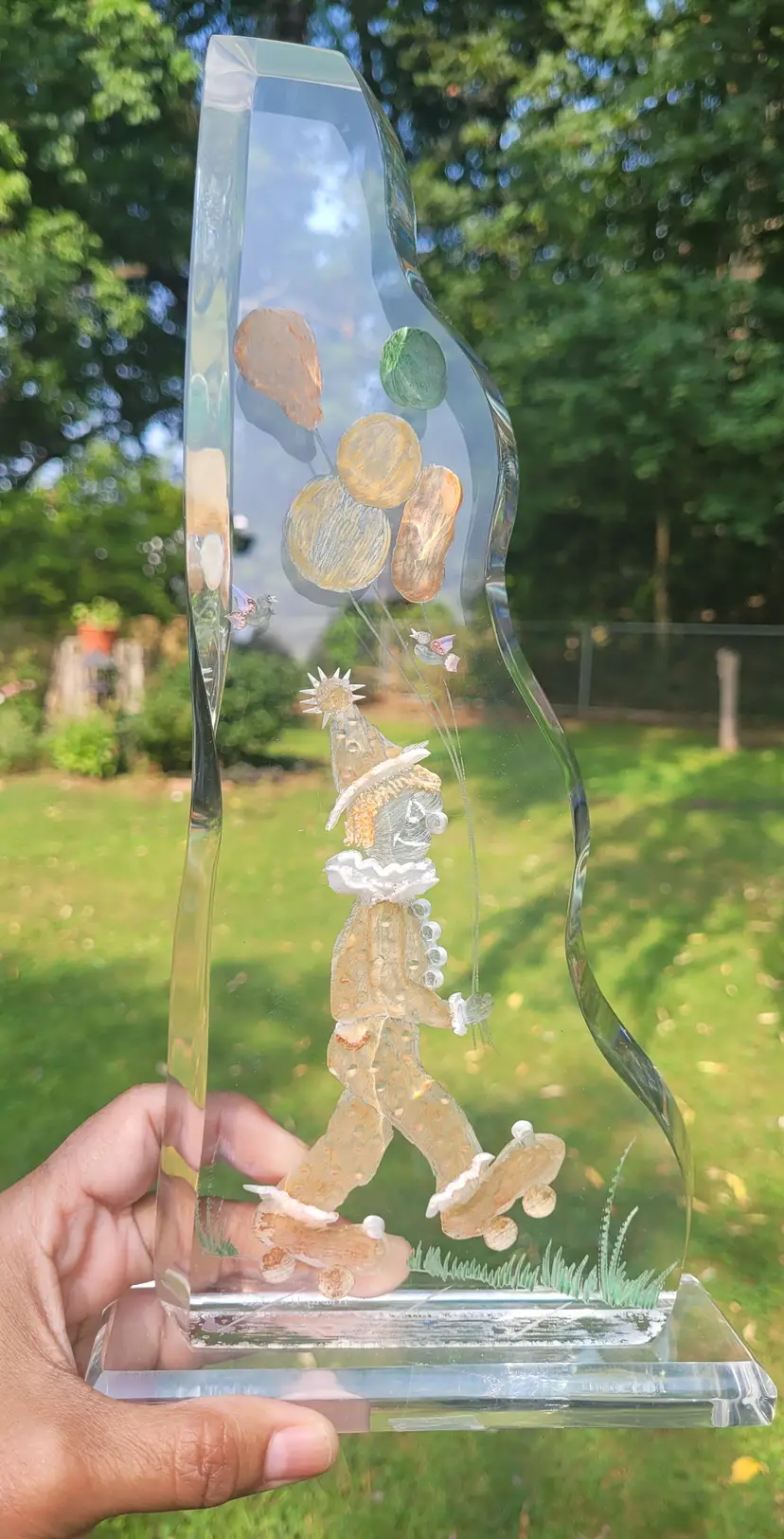 Tall Lucite Stand with Clown holding balloons indented in the smooth surface.
