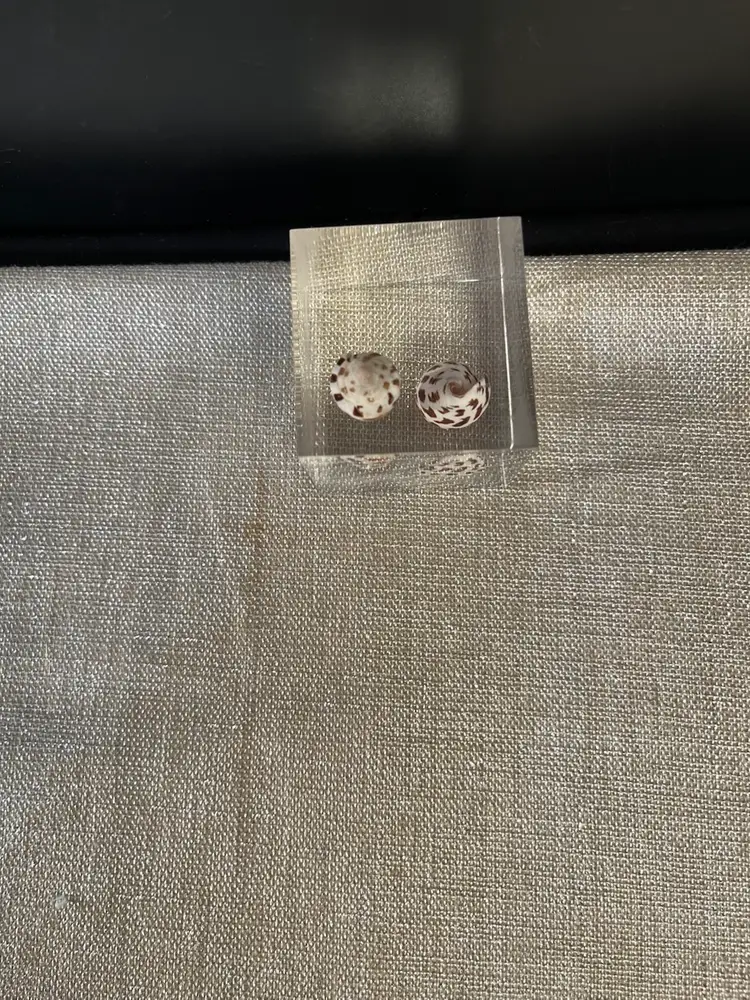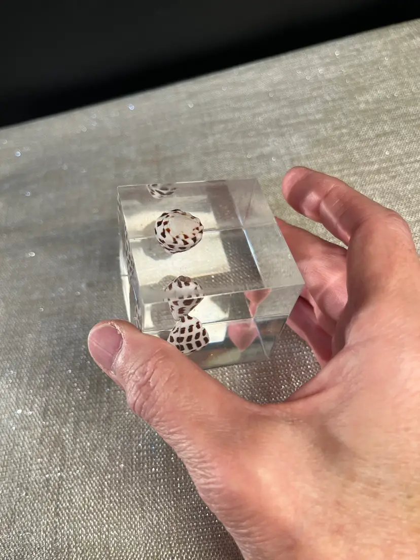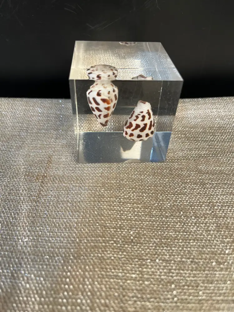 This is a pleasant paperweight. It has no call outs, it is not yellowing. Simple but cute. It measures approx 2" on each side, 4.8 Oz