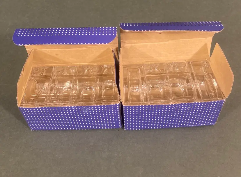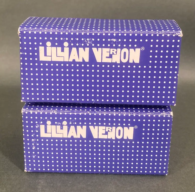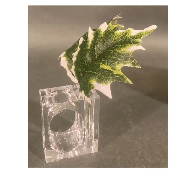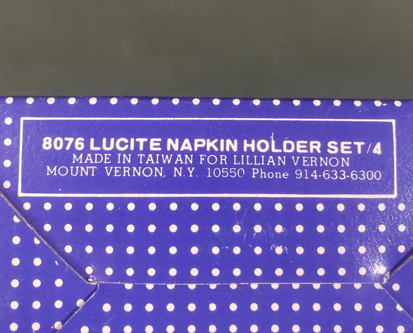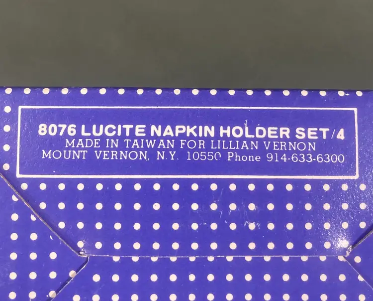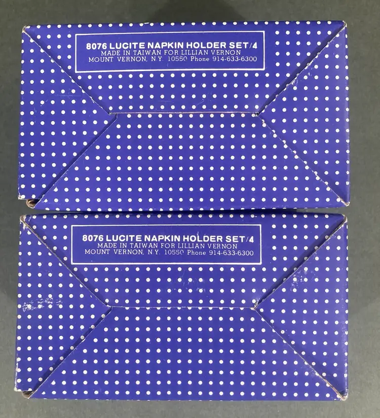Here we have two sets of four (eight total) Lillian Vernon lucite napkin rings in their original boxes. I think these are from the 80s, but lucite works great with a variety of vintage decorating styles. Each ring is about 2.25" x 1.75" x 1". The sides of the rings can be used as a bud vase, as I tried to show with the only piece of greenery I could find. Excellent condition.