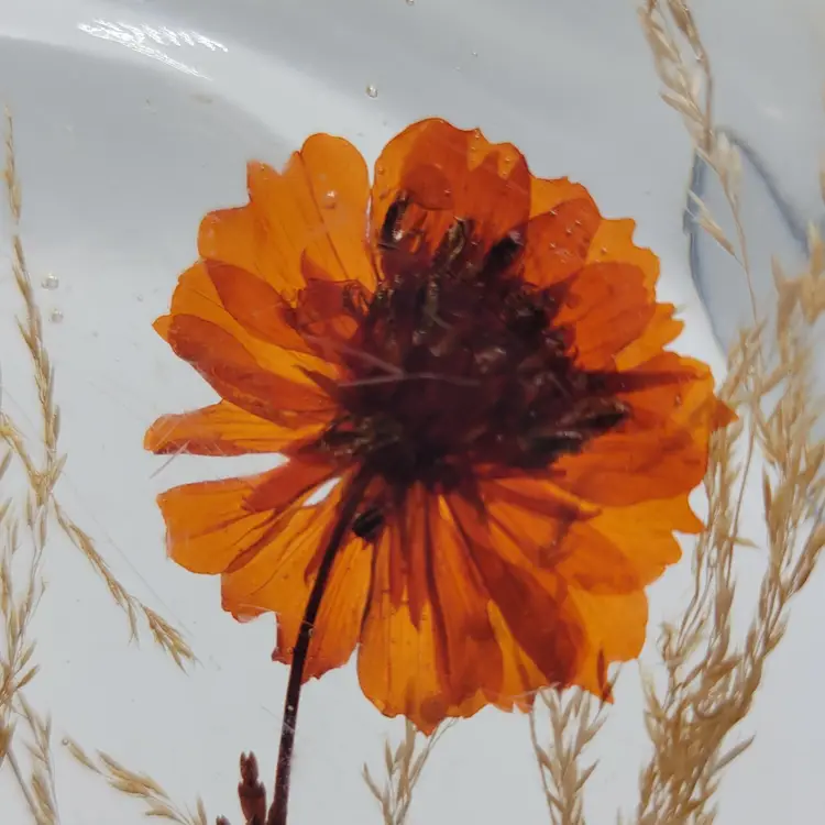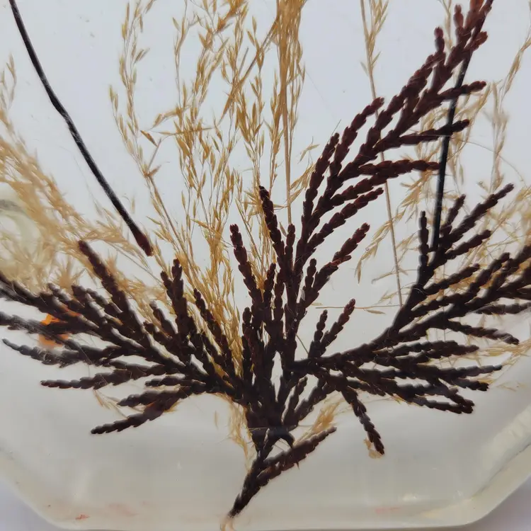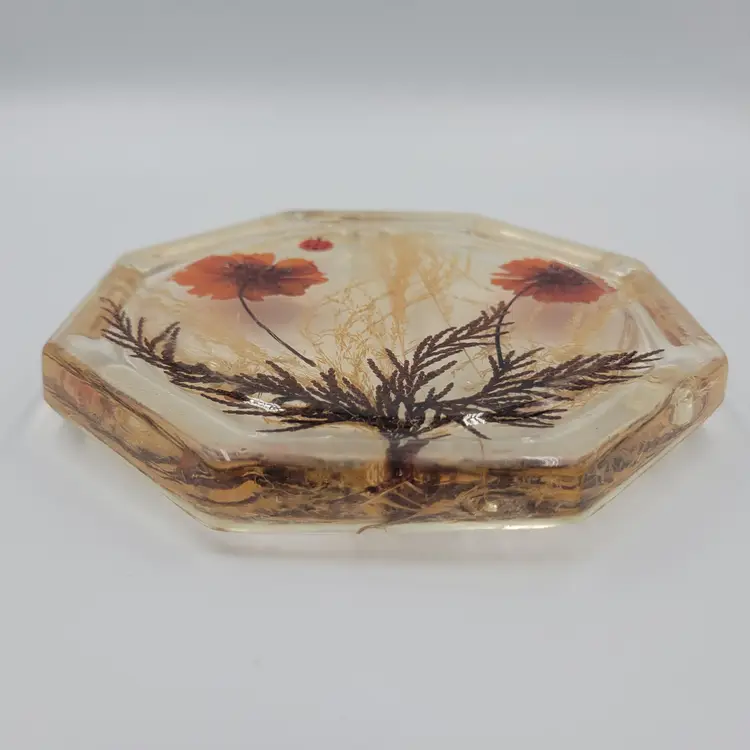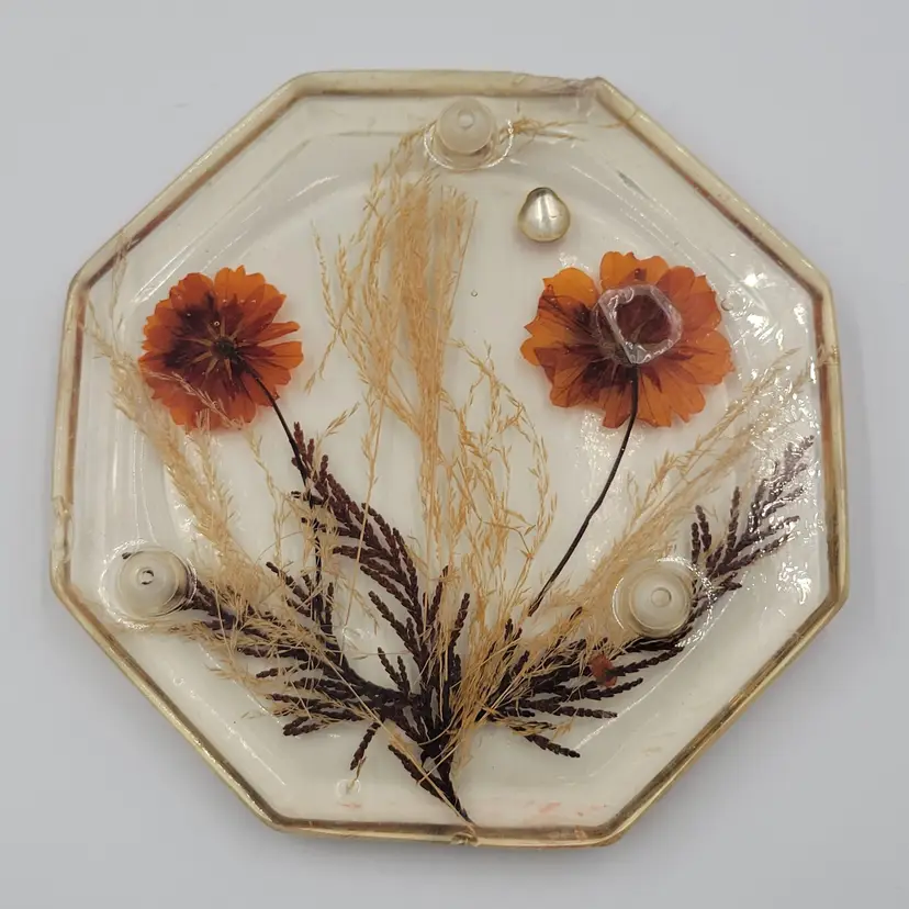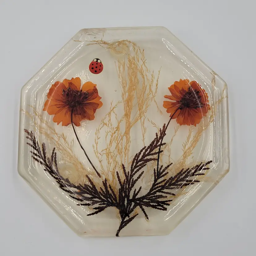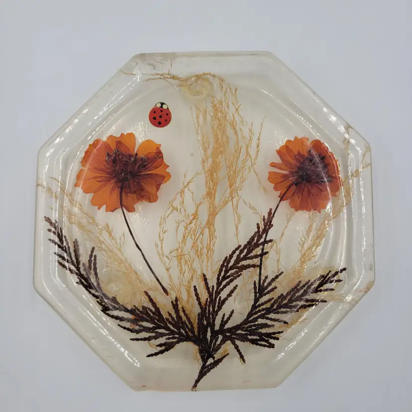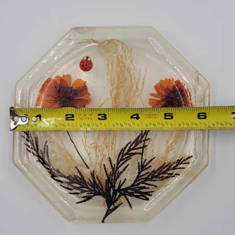This fun lucite trivet has 2 orange pressed flowers, filler grass and a lady bug. It has 3 feet on the bottom. It measures 6 inches wide. There are some minor scratches on the top (see photos). There are a few chips on the bottom edge (see photos).