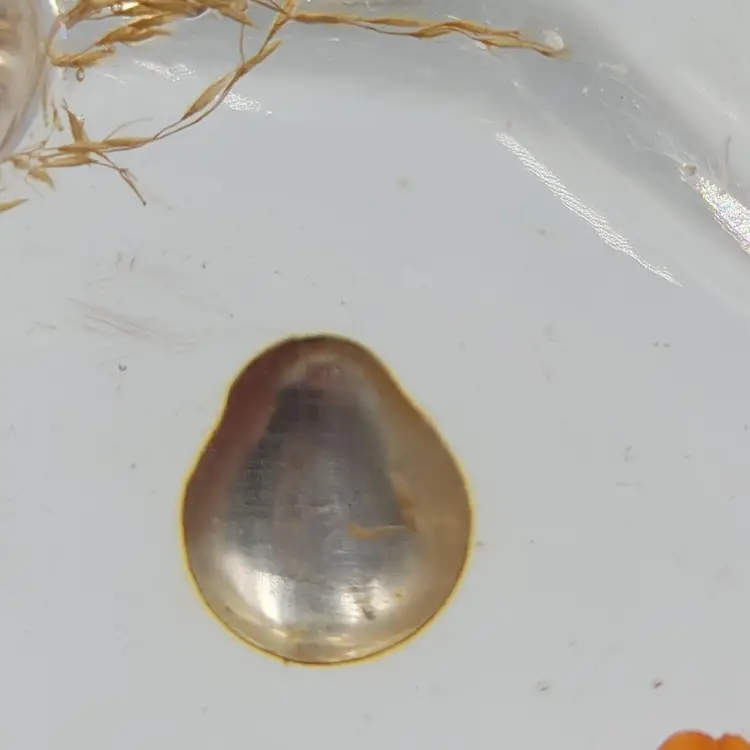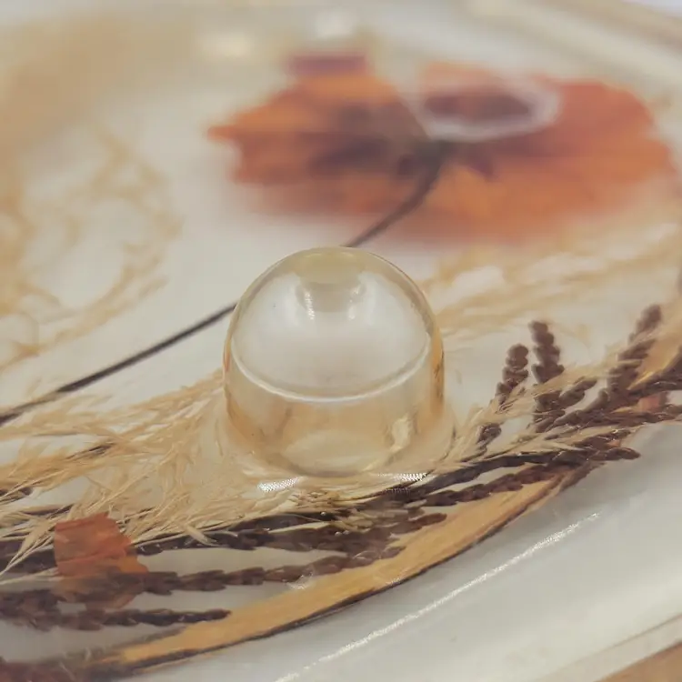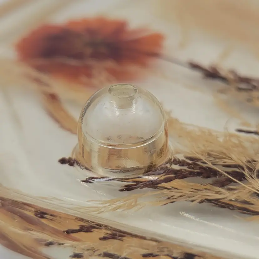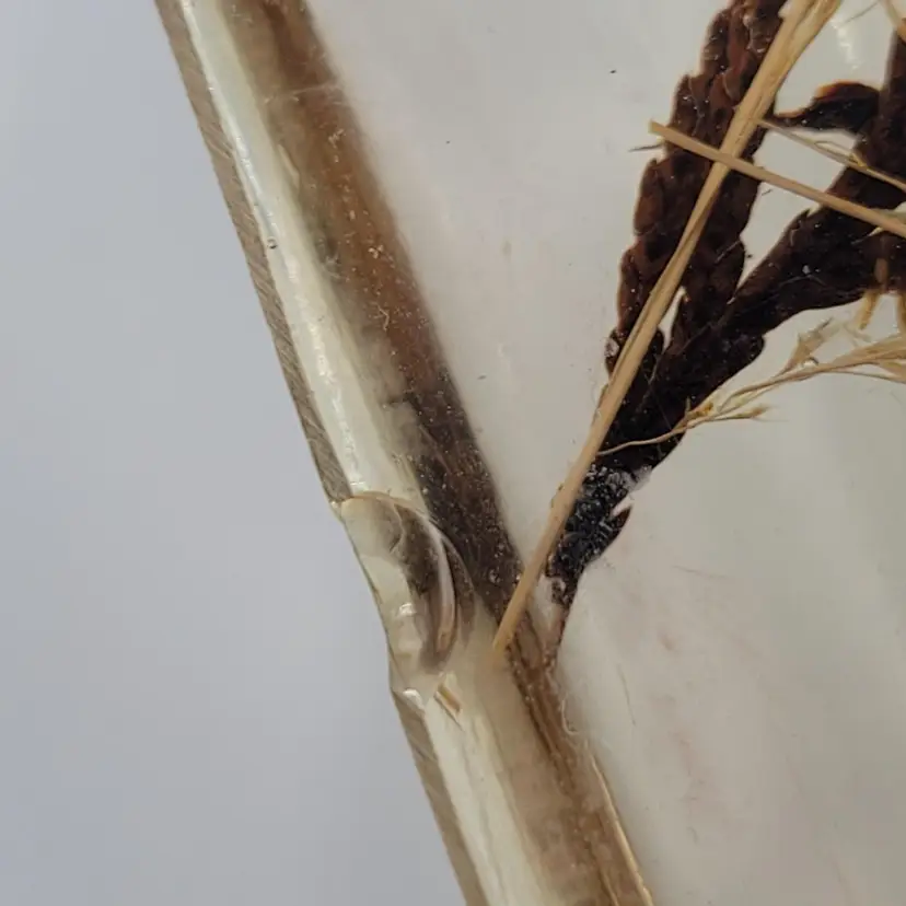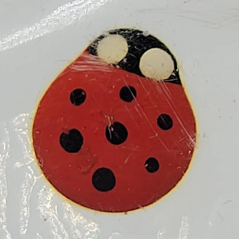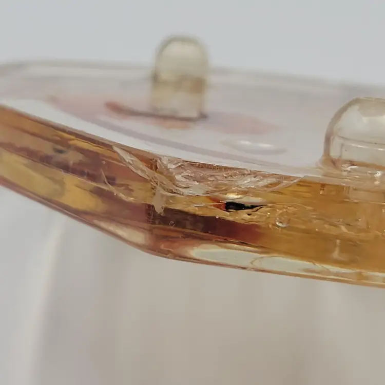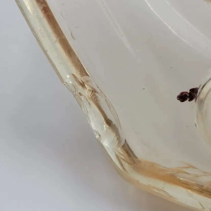 This fun lucite trivet has 2 orange pressed flowers, filler grass and a lady bug. It has 3 feet on the bottom. It measures 6 inches wide. There are some minor scratches on the top (see photos). There are a few chips on the bottom edge (see photos).