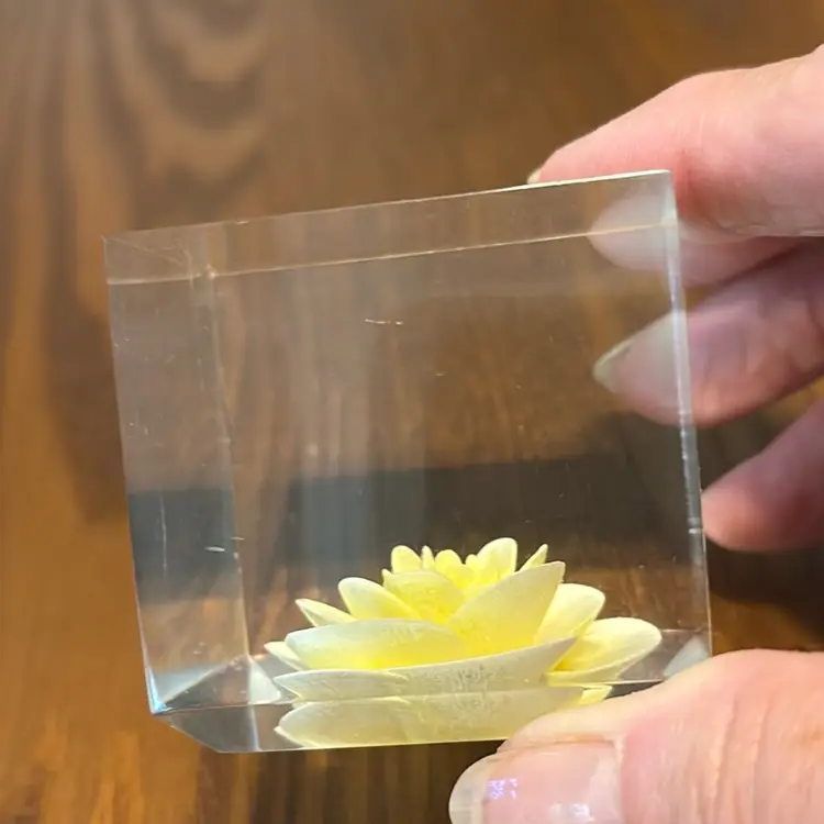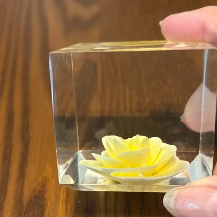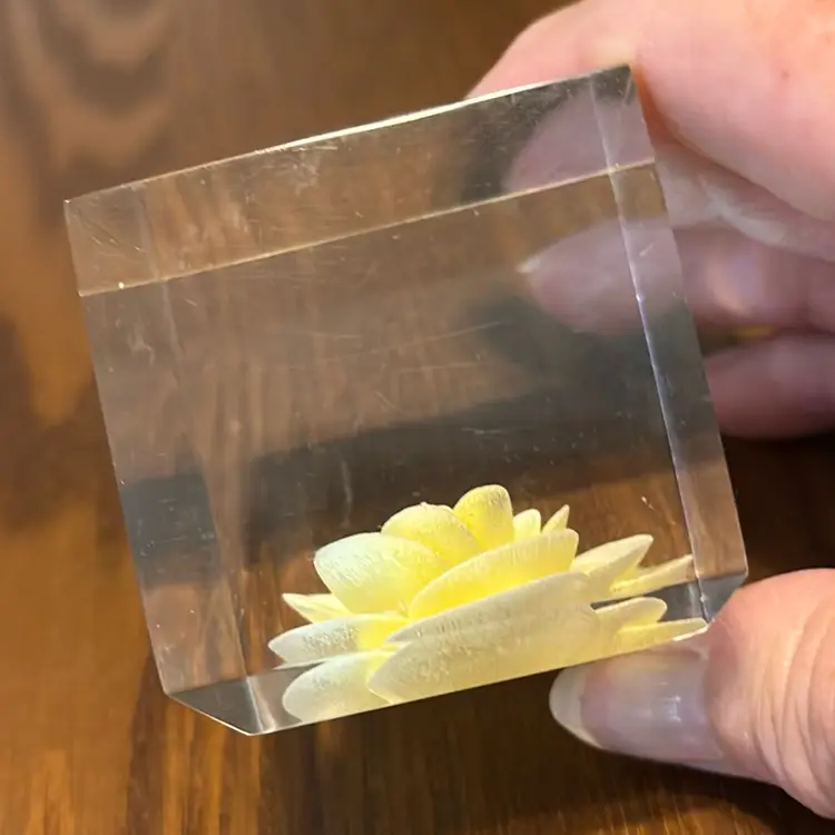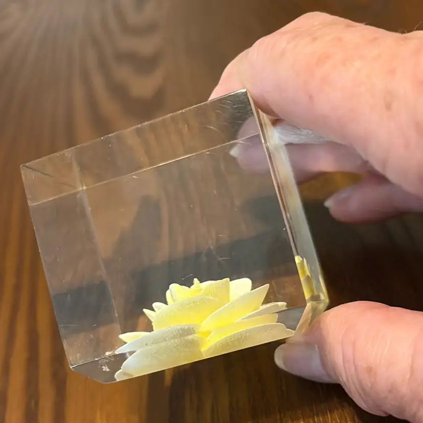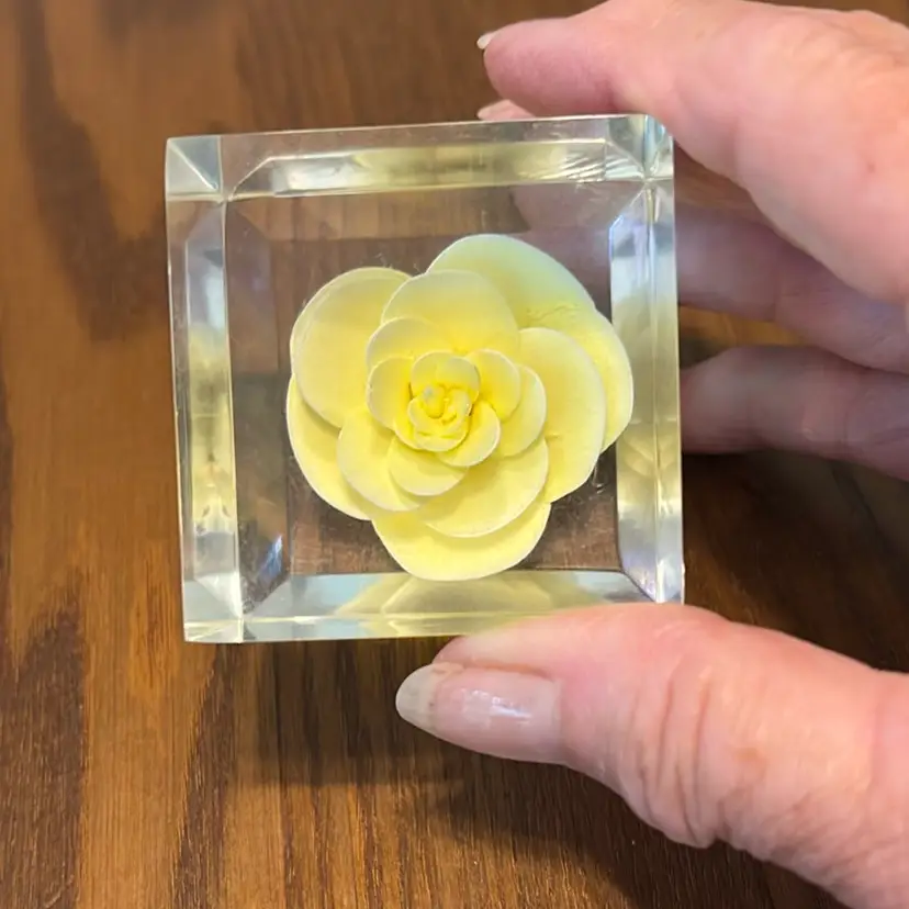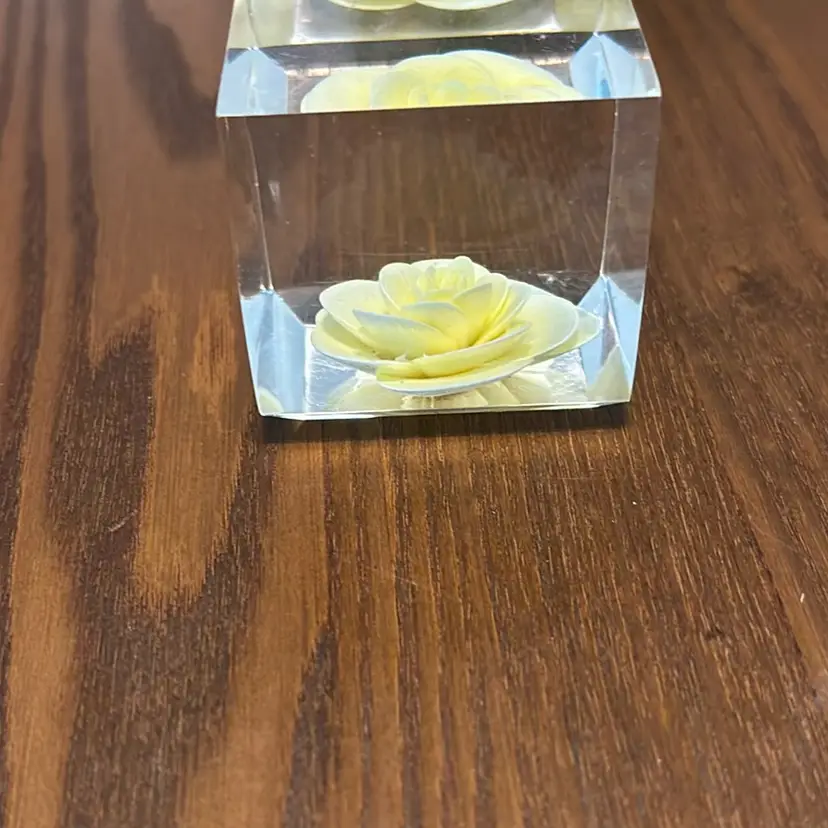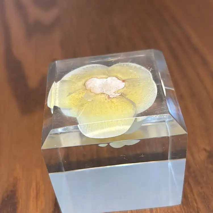 2 inch square clear with yellow flowering center. No chips or cracks, beveled on the bottom. Minor scuffing on 2 sides, see pics