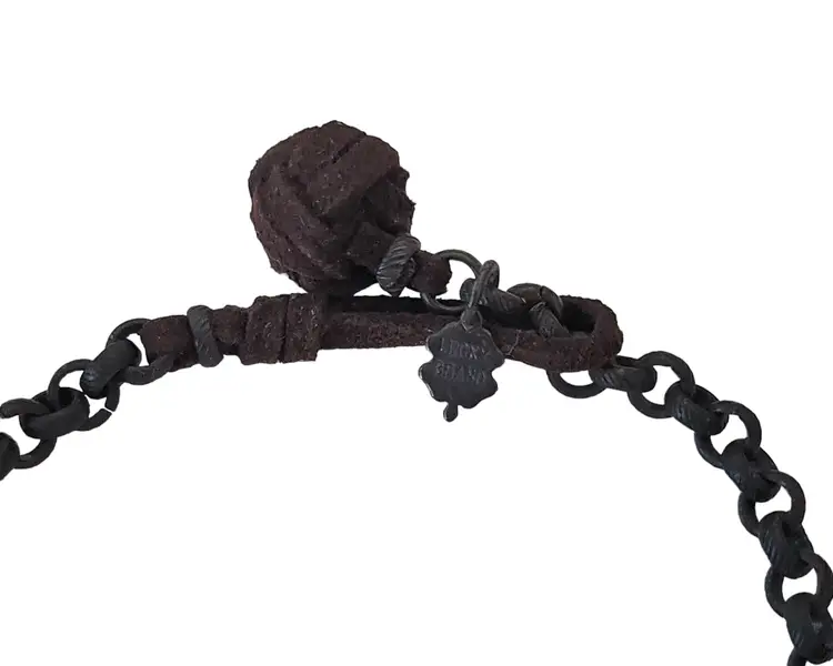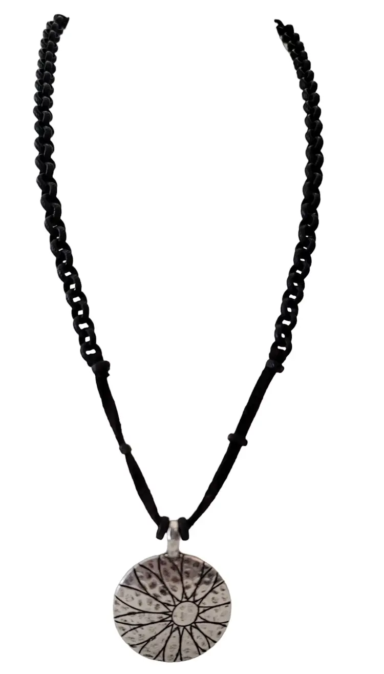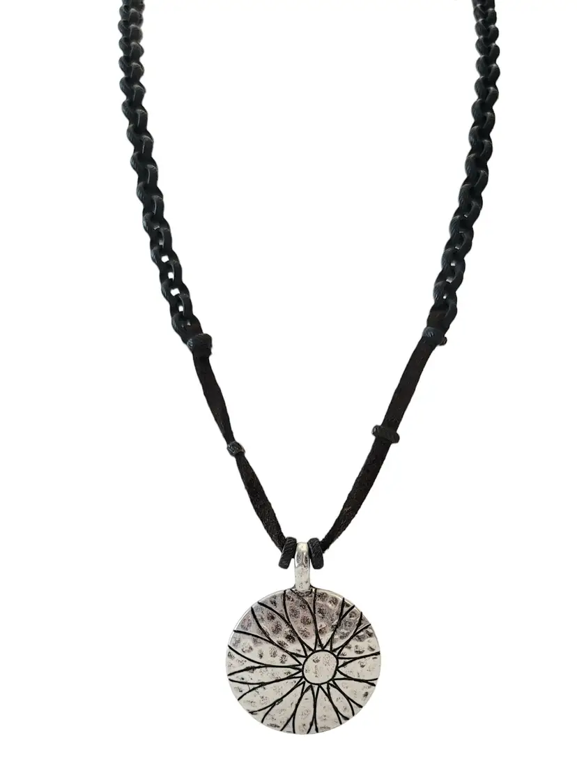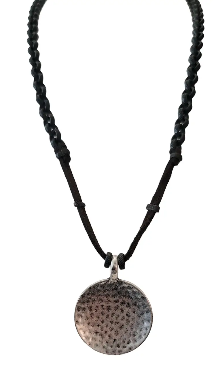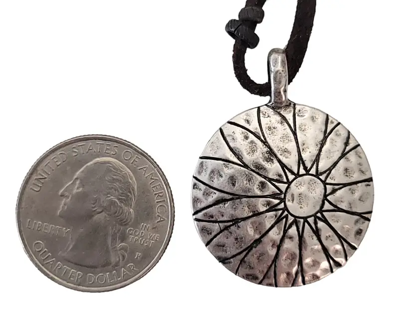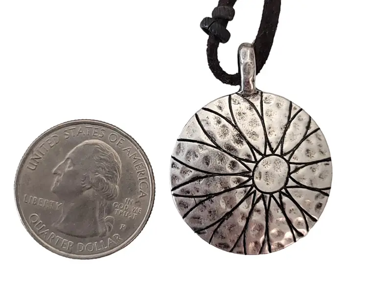 This Lucky Brand Necklace makes a wonderful statement piece. It features brown suede cord necklace of chunky open weave pattern and plain knotted portions for where the Medallion Pendant is attached to. The pendant is a silver tone round-shaped piece decorated with floral markings with a hammered metal effect, perfect for complementing your cool look. This stunning necklace measures 18 inches in total length. Secured with a ball knot and loop closure with a signature Lucky Brand clover charm hanging next to the clasp. This handmade clasp makes this accessory easy to put on and take off.
