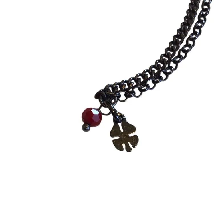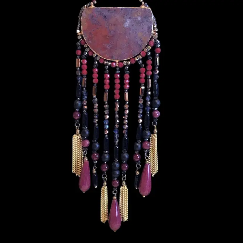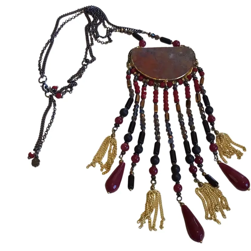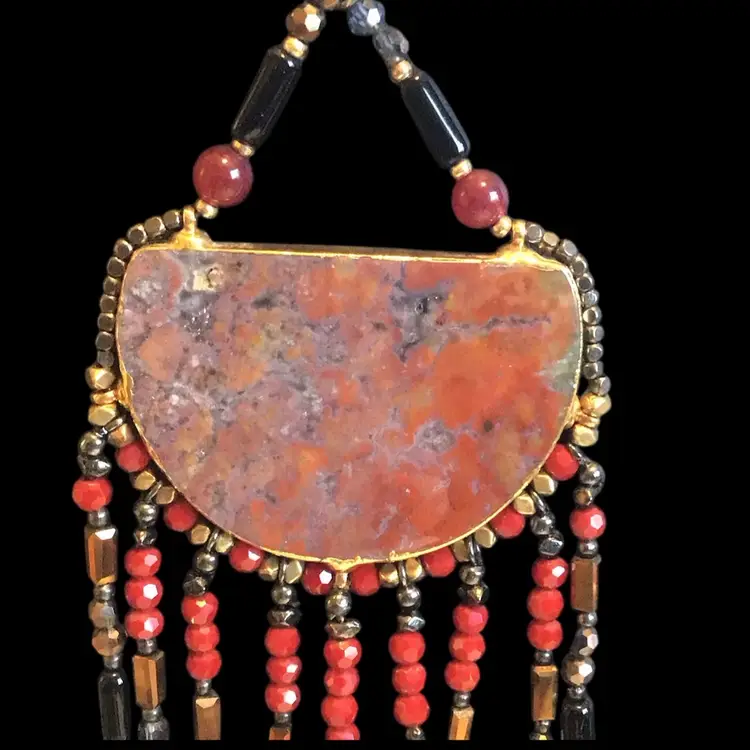 Flame jasper pendant with glass bead fringe. Large tear drops test as quartz, gold accents. 4 leaf clover hang tag is Lucky Brand, 16”- 20”. #748