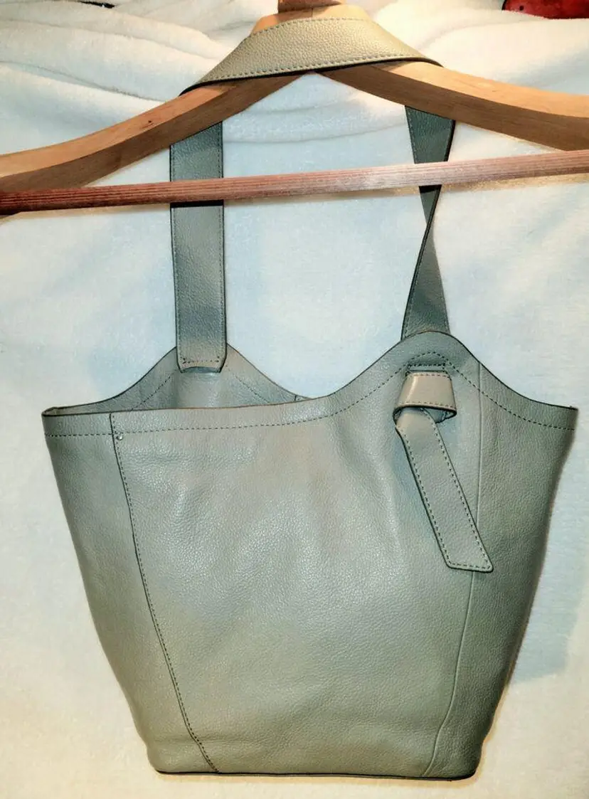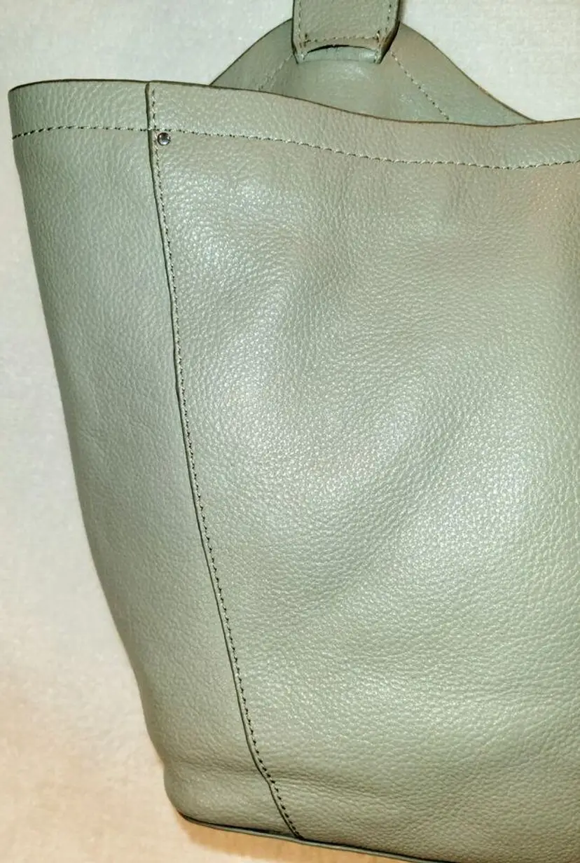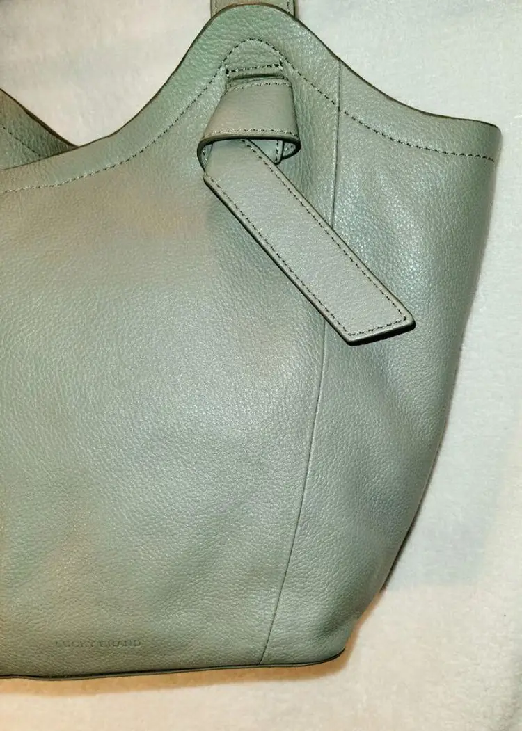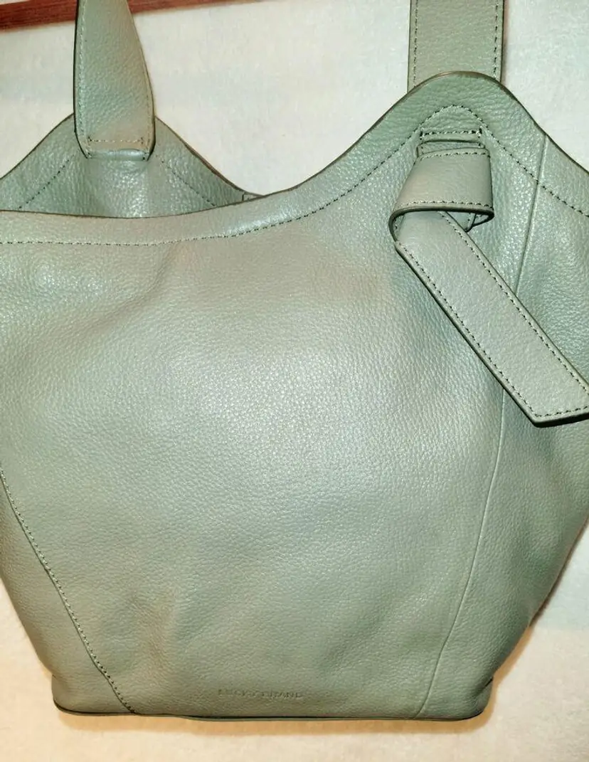 Lucky Brand Shoulder Strap Tote - Neutral Olive Color, Very Soft High-Quality Leather in a Relaxed Casual Style, Unique Shoulder Strap Design, Magnetic Closure and Inside Pockets, Beige / Neutral Fabric Lining with Pockets which are outlined with leather - One Zipper Pocket and 2 Slip Pockets.