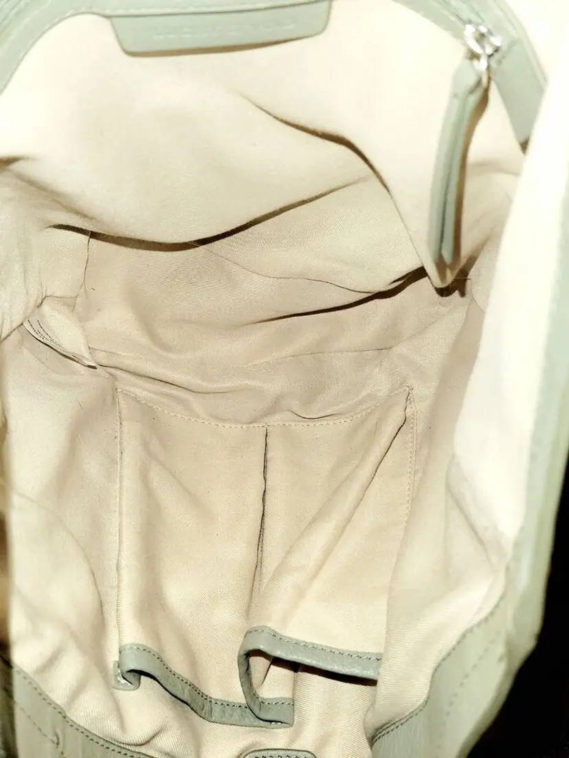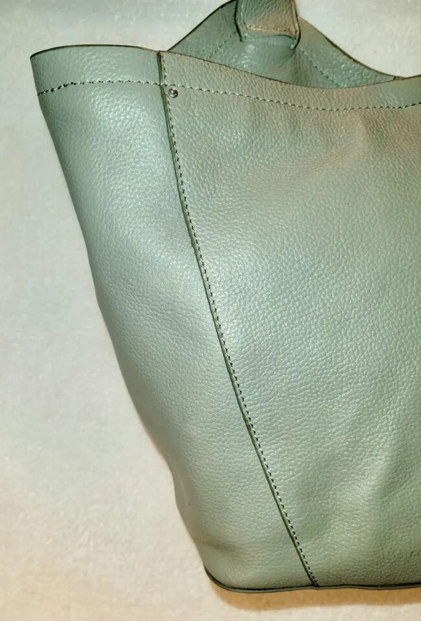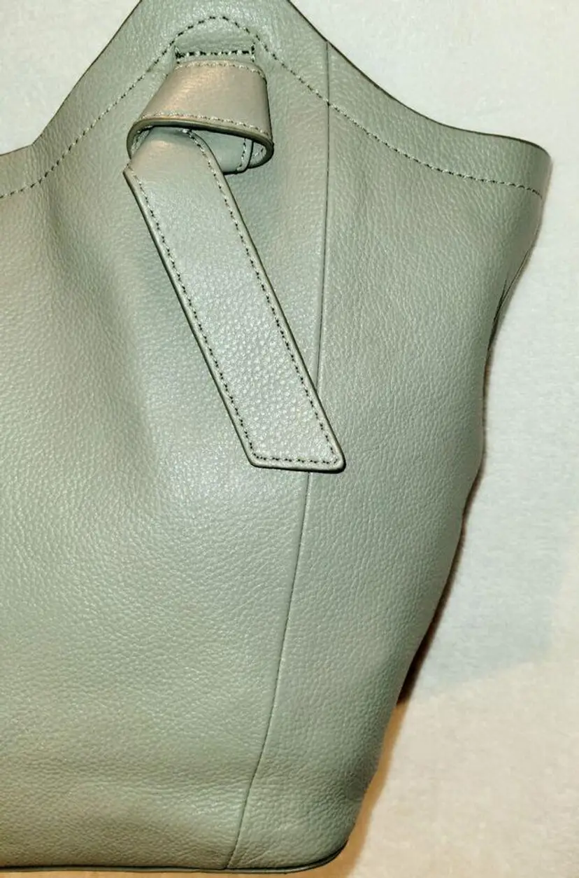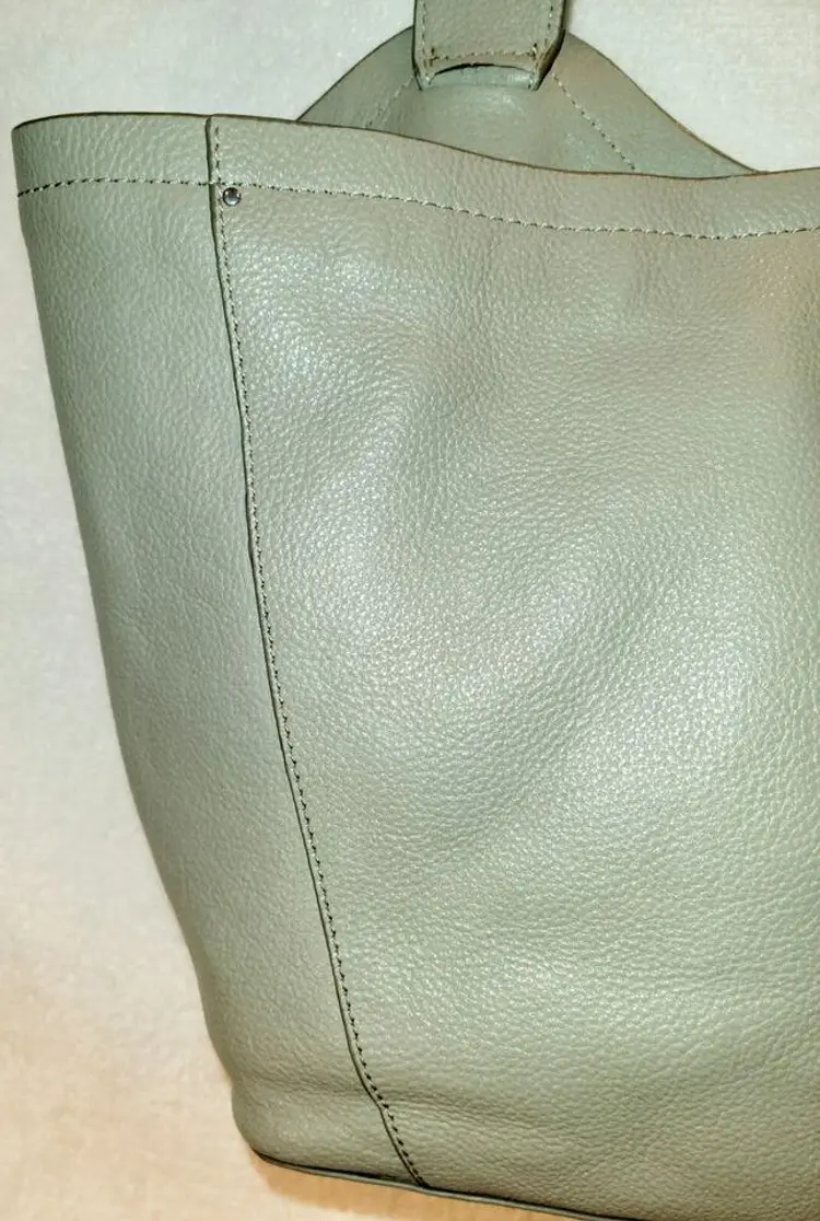 Lucky Brand Shoulder Strap Tote - Neutral Olive Color, Very Soft High-Quality Leather in a Relaxed Casual Style, Unique Shoulder Strap Design, Magnetic Closure and Inside Pockets, Beige / Neutral Fabric Lining with Pockets which are outlined with leather - One Zipper Pocket and 2 Slip Pockets.