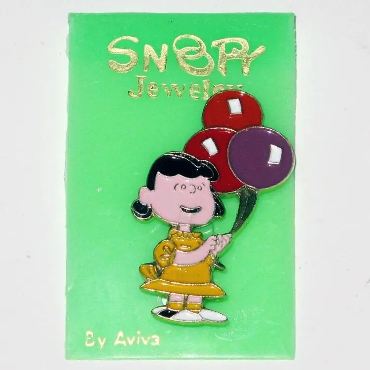 Brighten up your collection with this charming Lucy Balloon Pin from Aviva's Snoopy Jewelry line. Featuring Lucy holding colorful balloons, it's a delightful accessory for any Peanuts fan. Perfect for adding a playful touch to your outfit or collection. Comes on the original card and is unused.
