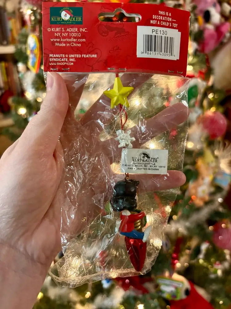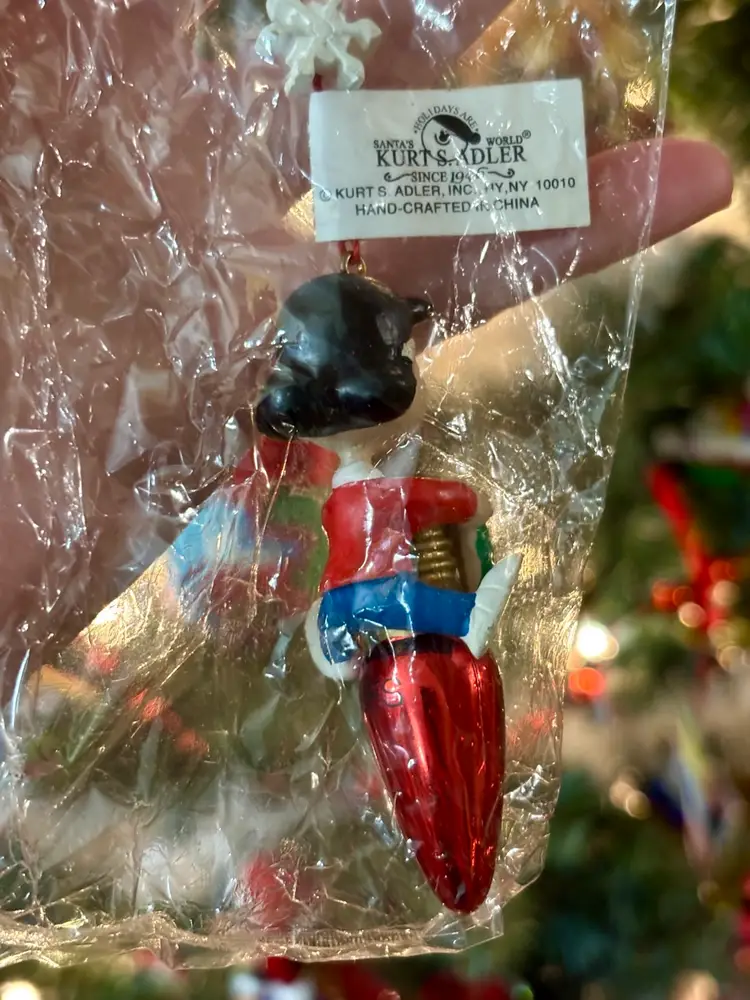 This is a super cute Lucy ornament from Kurt Adler. Lucy is sitting atop a red Christmas light bulb. New in package.