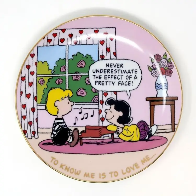 Add charm to your collection with this delightful Lucy & Schroeder Valentine's Day Decorative Plate. Featuring Lucy's classic line, 'Never underestimate the effect of a pretty face!' and a sweet scene with Schroeder at the piano, it's perfect for any Peanuts fan. Made by Danbury Mint.