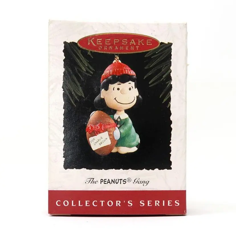 Celebrate the classic Peanuts moment with this charming Lucy ornament, featuring her iconic football and a tag for Charlie Brown. Perfect for adding a playful touch to your holiday decor or Peanuts collection. Made with attention to detail, this Hallmark ornament is a must-have for fans of all ages. With the original box.
