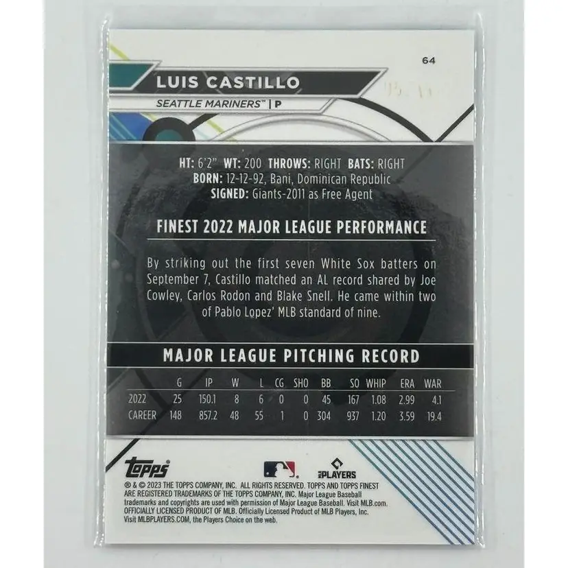 Luis Castillo 2023 Topps Finest Blue Refractor /300 Seattle Mariners