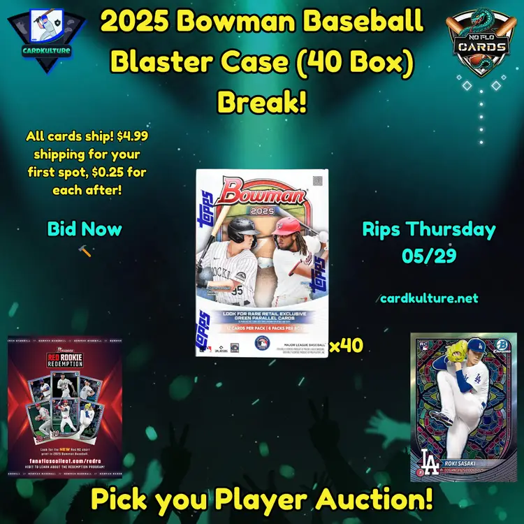 You are bidding on the card(s) listed in the title in this 2025 Bowman Baseball Blaster Case (40 Box) Rip! Case will be opened LIVE on Thursday, 5/29/25, at apx 8:30 PM Eastern. Opening will be viewable & simulcast on Cardkulture, Twitch, Youtube, Instagram, Twitter or TikTok. US Shipping is $4.99 for your first auction spot won; any additional spots won are only $.25 additional shipping! Any card with 2 or more players that do not have a separate spot will be randomized between the two owners, unless both owners come to an agreement. Most auction spots won for the rip will get a free blaster box of 2025 Bowman mailed with your break! Please note that base paper is it's own spot, you will receive all chrome, autos, #'d chrome and #'d paper for your spot. Good luck!