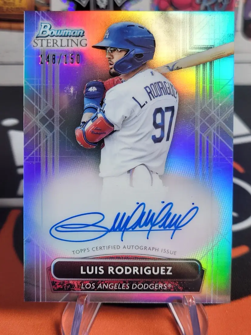 Up for sale is a 2022 Bowman Sterling Prospect Autograph Refractor featuring Luis Rodriguez, numbered /150. This card combines a sleek refractor surface with an on-card autograph, and is from the high-end Bowman Sterling release — popular with prospect collectors.