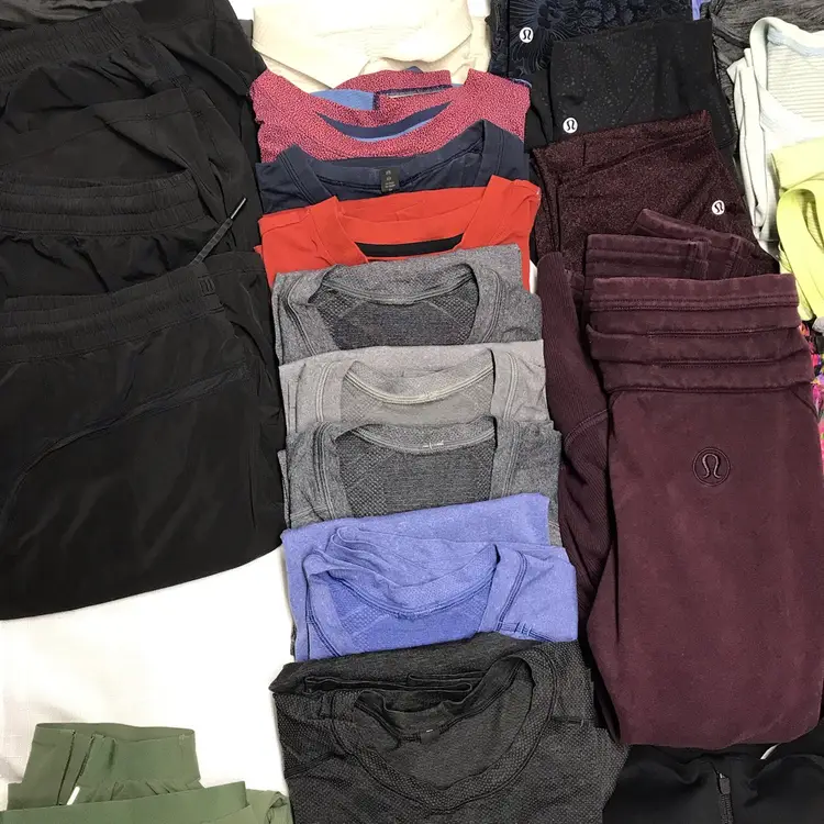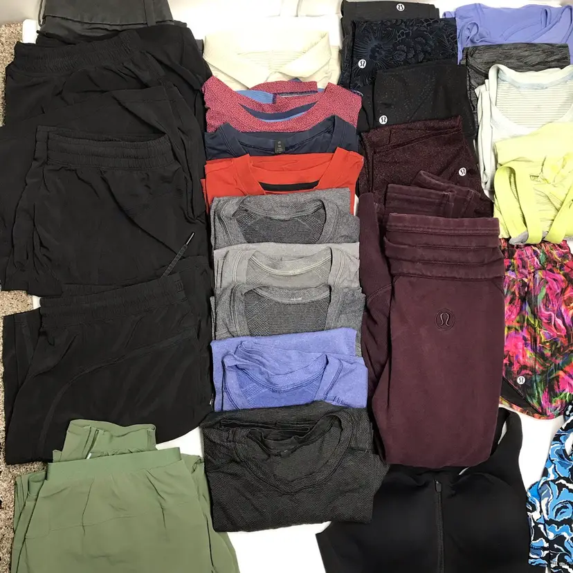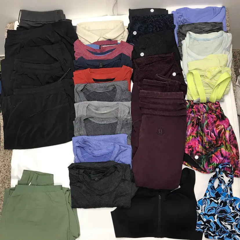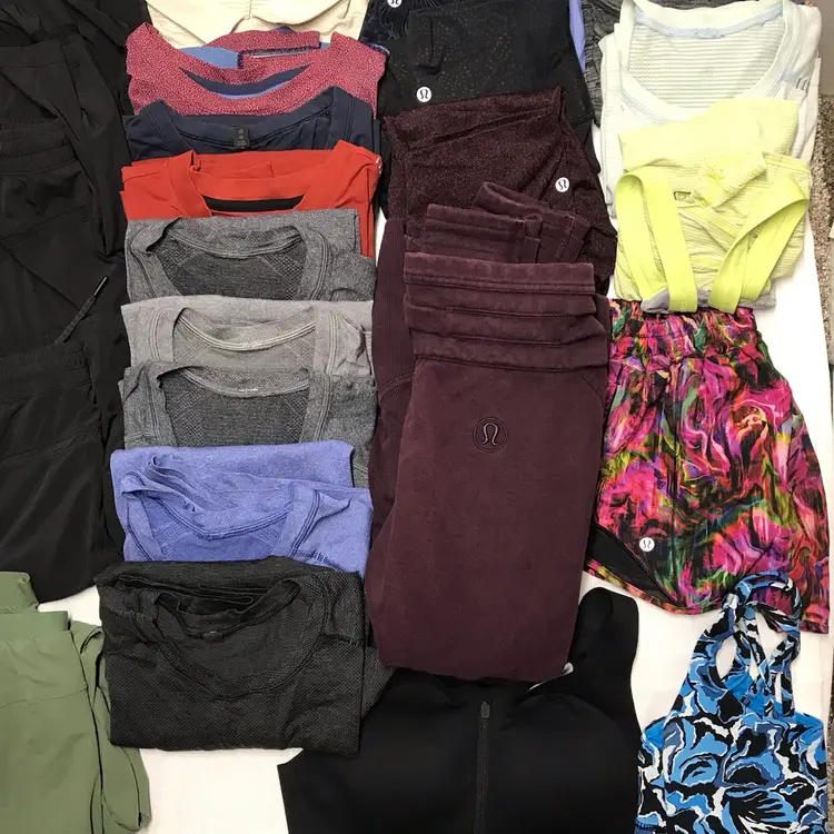 1 pair of ABC mens shorts 30 3 pairs of mens lined shorts L 1 pair of mens studio pants L 7 mens metal vent shirts most xl 1 mens polo M? 1 Enlite bra 36C 1 floral bra size 6 1 pair womens shorts 4tall 1 scuba sweater 4 leggings 1 long sleeve metal vent womens 3 womens tops