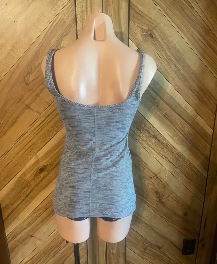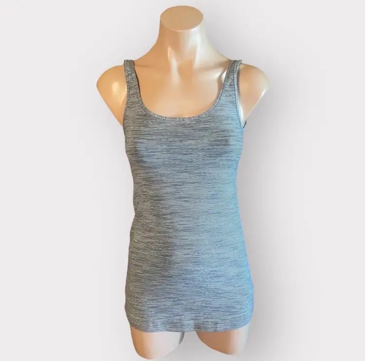 Its hip-length cut provides moderate coverage, making it a great match for your favorite high-waisted leggings. • Condition: Very Good Used Condition (VGUC) • Size: 4 • Style: Racerback / Scoop Neck • Color: Heathered Gray and White Stripes • Material: Lightweight, breathable performance blend • Racerback Design: Allows for unrestricted shoulder movement. • Scoop Neckline: Offers a feminine and functional fit. • Breathable Fabric: Designed to keep you cool during low-to-medium impact activities. • Versatile Style: Seamlessly transitions from the studio to a casual weekend look.