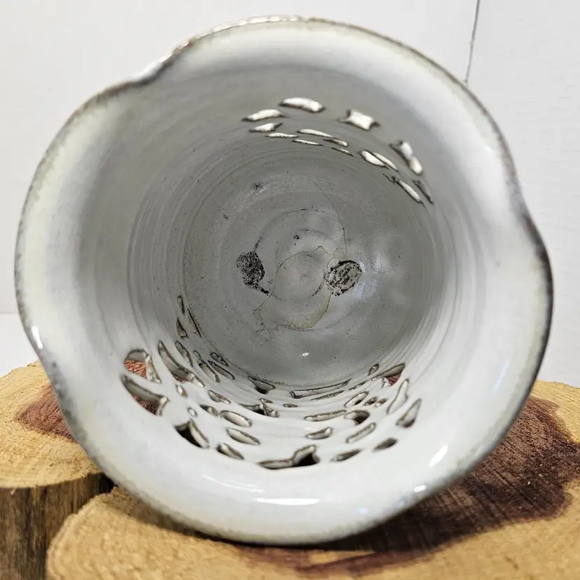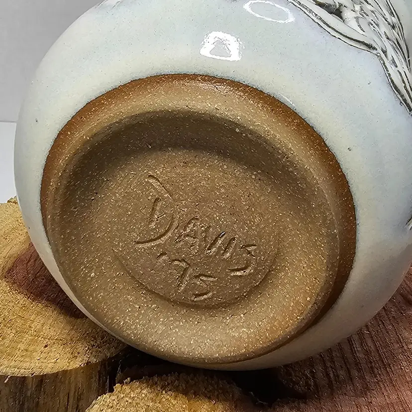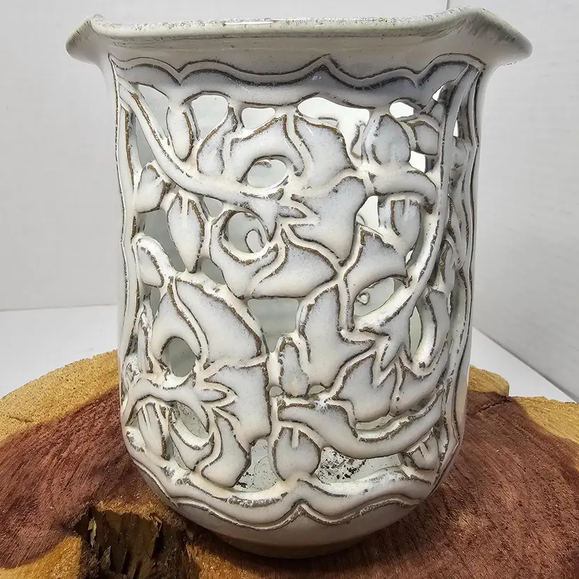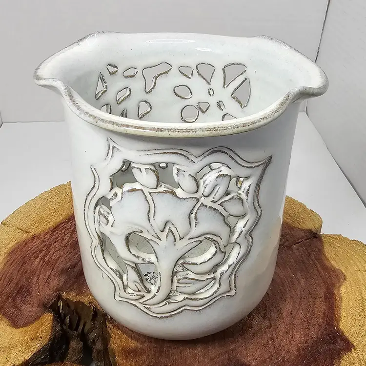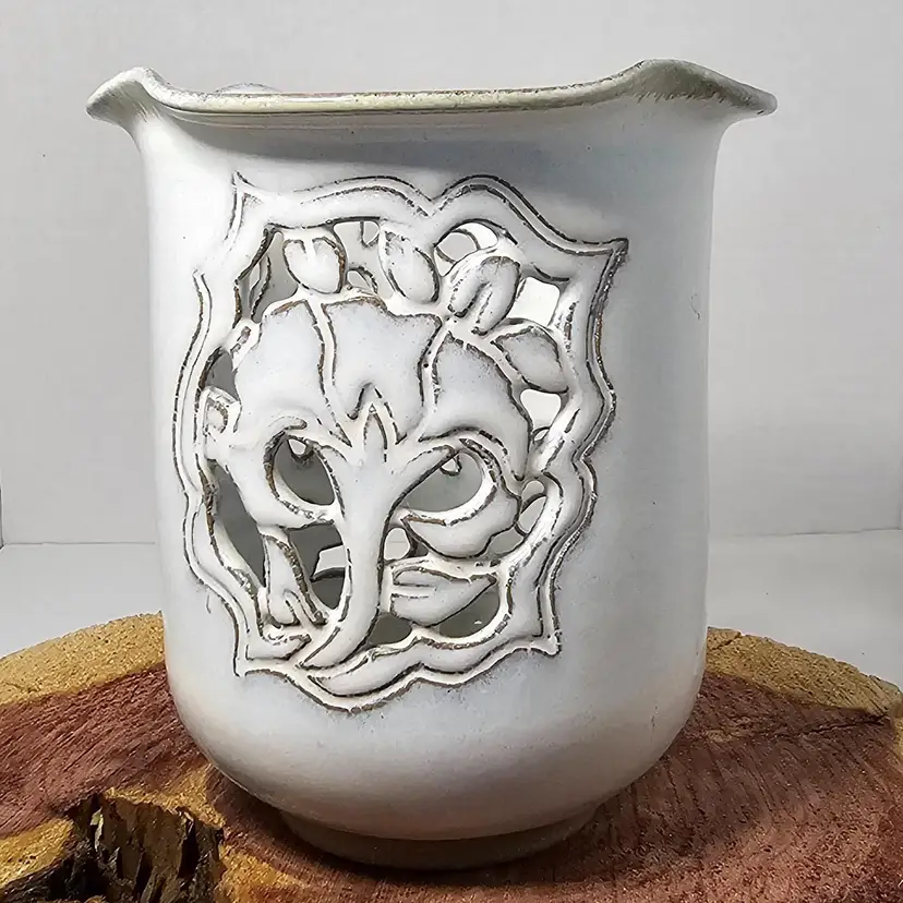 Carved on both sides with different scenes. One side is a beautiful tree the while the other is incredible leaves, flowers and scroll work. A beautiful glaze with a glossy white wash effect. Signed Davis '75. I do not see any chips or feel any bruises but I do encourage you to look at all of the photos before purchase. This is a beautiful piece by itself or lit from the inside. It is approx. 6" tall and 4" across. (narrower at the base) I have watched potters demonstrate this technique and it is stunning to watch them work. Cutting out all the tiny little pieces and etching lines to make a work of art on what is already a work of art. It looks as though it has held a regular candle at one point, but battery operated lights would work just as well. This would fit a votive, a tea light, or a 4 inch pillar. It would be pretty decorating a shelf with a colored candle in it to show off the carving. Thank you for supporting my small business.