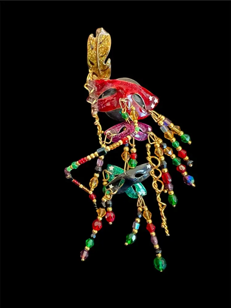 This piece is signed by the brand and showcases a Mardi Gras theme, making it a unique and eye-catching addition to any jewelry collection.