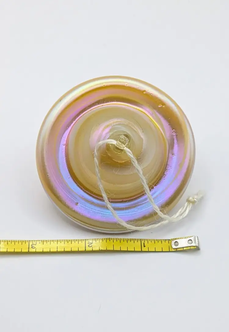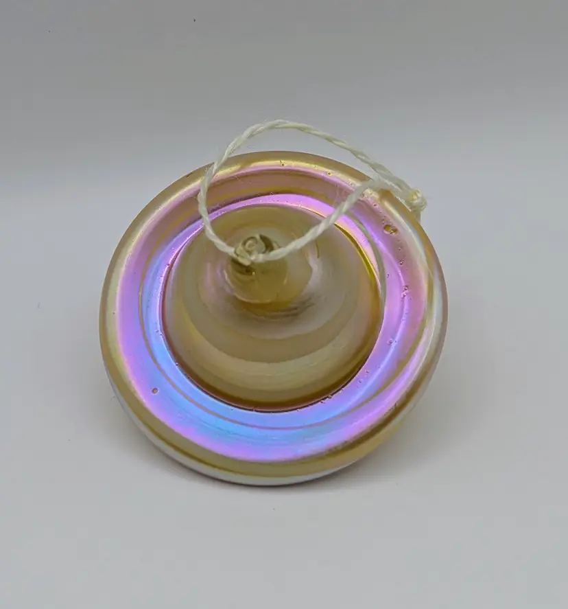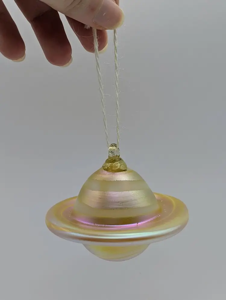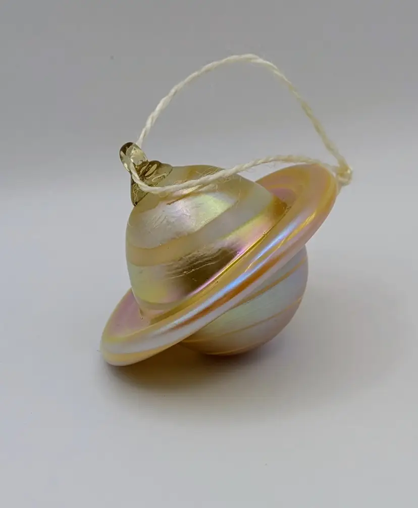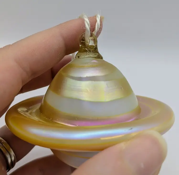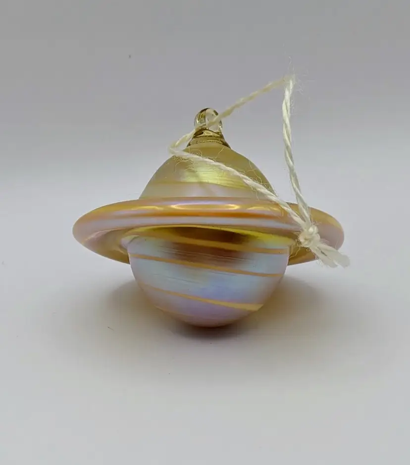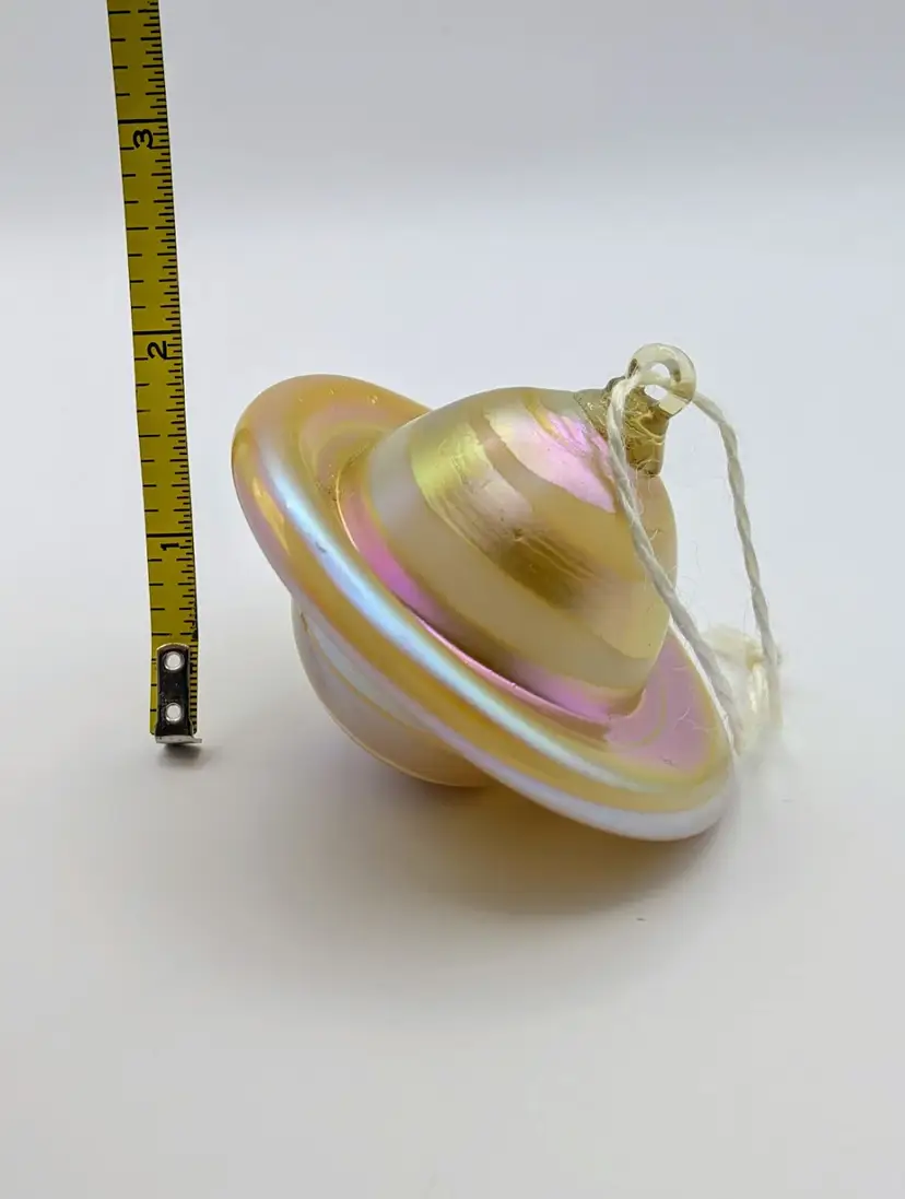 Dainty gold saturn ornament, signed L.S. 87 made by Lundberg studios. It is approximately 1.75 inches tall and 2.75 inches wide. EUC, there are small surface bubbles that appear to have been from the manufacturing process