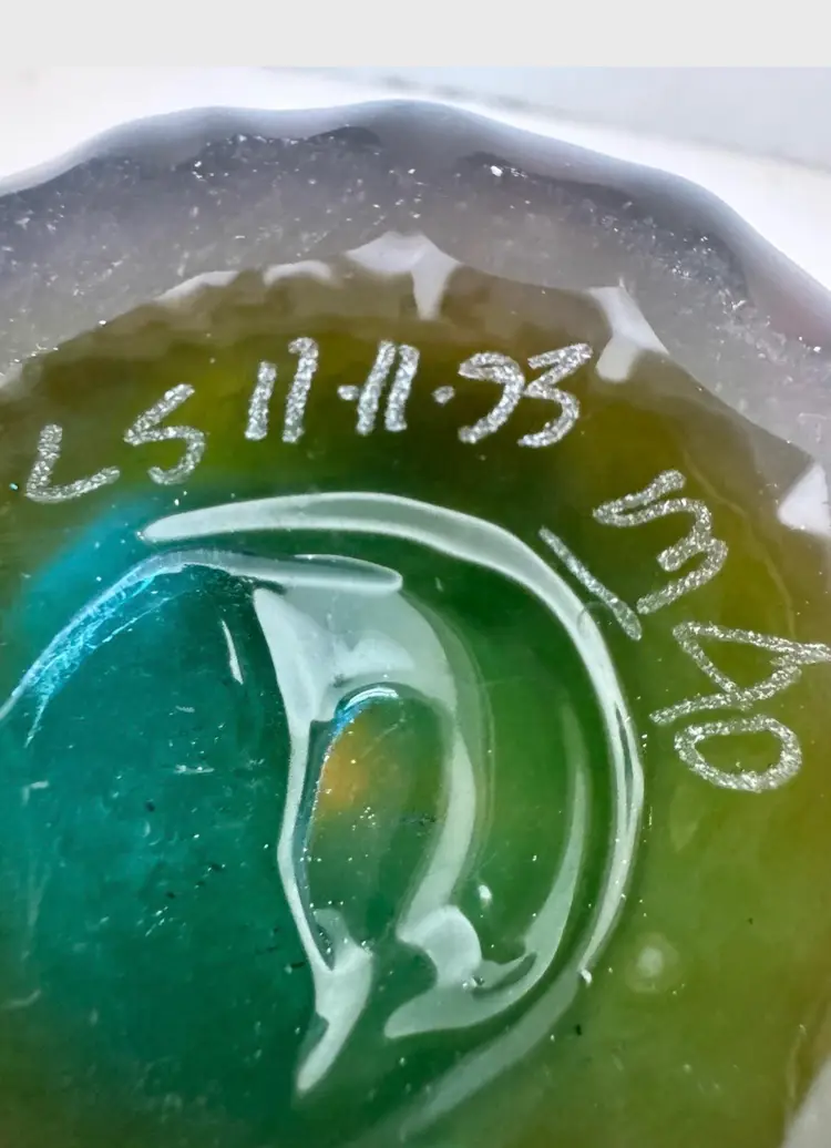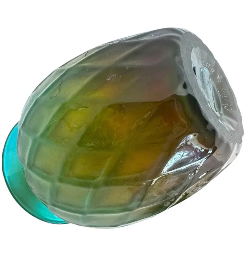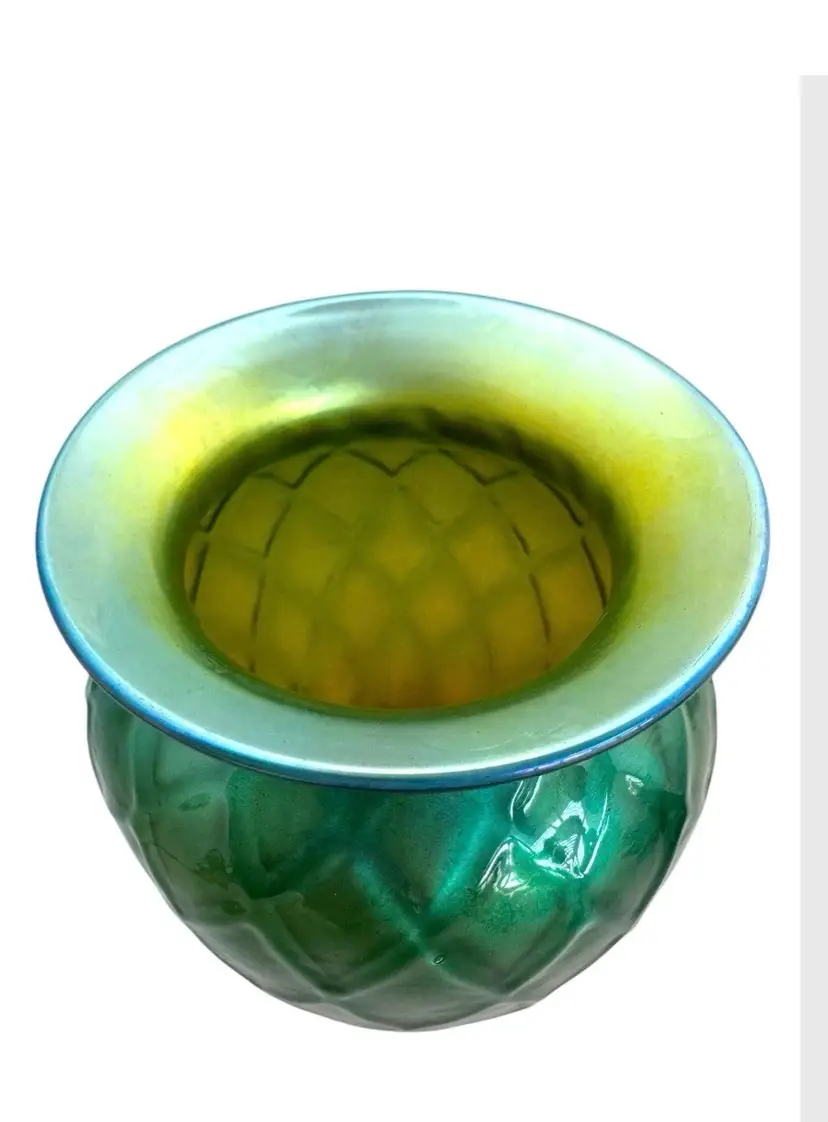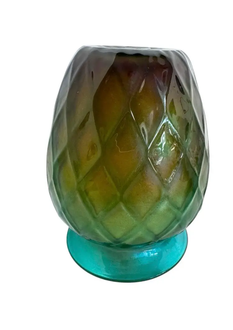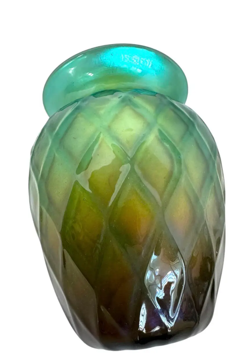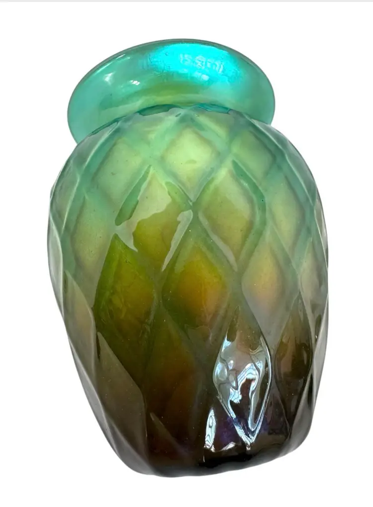 gorgeous vintage Lundberg studios ombre Blue , green , gold, and deep plum iridescent/multicolor Handblown art glass vase with a glossy overlay quilted diamond pattern. No chips or cracks. 5.25”’x 4”. Signed LS and dated 1993 as well as numbered.