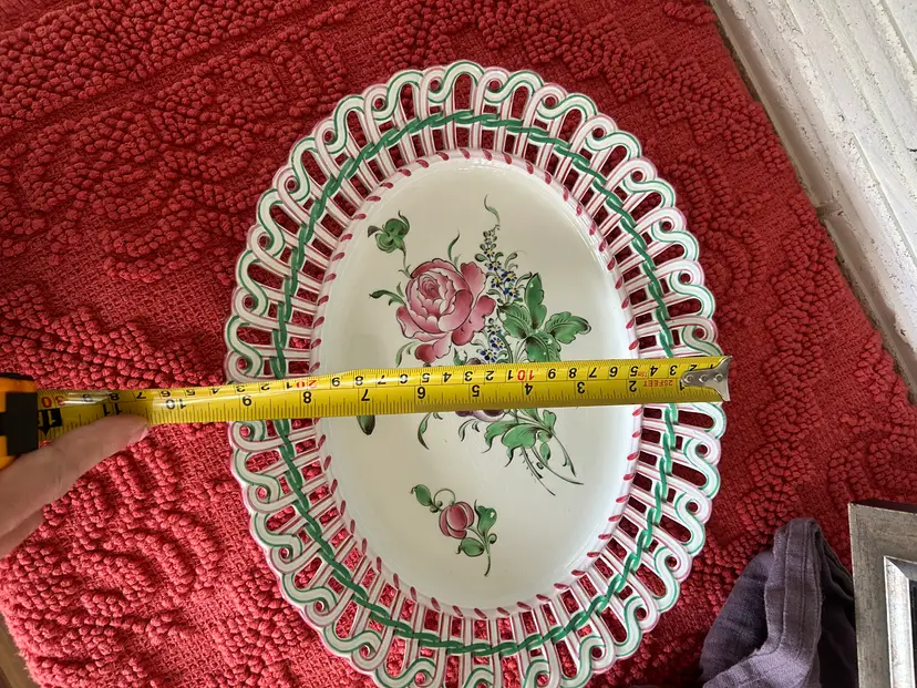 This decorative plate was produced by the Luneville faience factory in France, likely dating from the early to mid-20th century. It features hand-painted floral motifs in the traditional Strasbourg style with a distinctive pierced or reticulated edge combining pink and green accents.
