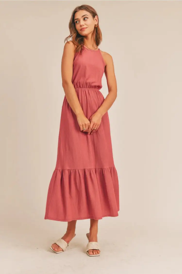 High Neck Sleeveless Tiered Midi dress Casual midi dress made in light & breezy fabric to dress up or down Pull on Tie back Elastic stretch waist Tiered style crepe fabric lightweight 95% Polyester 5% Elastane Size XL Excellent pre-owned condition - no stains, or holes Please see all photos