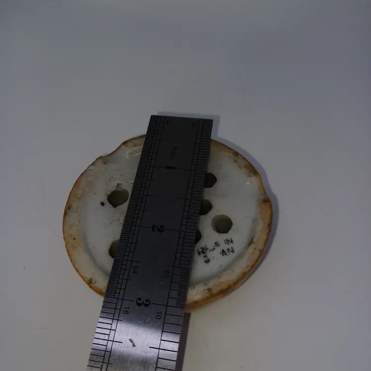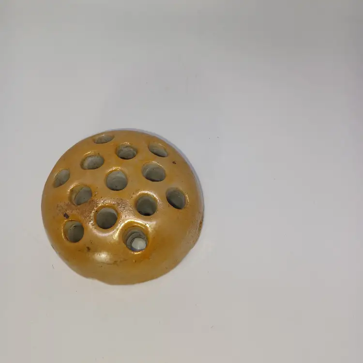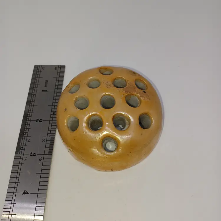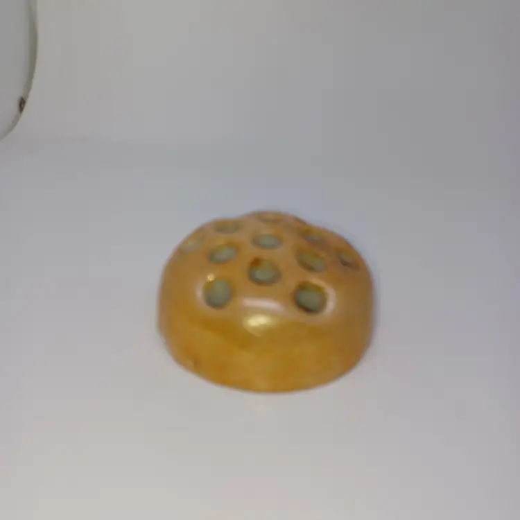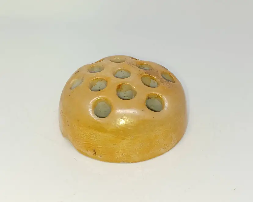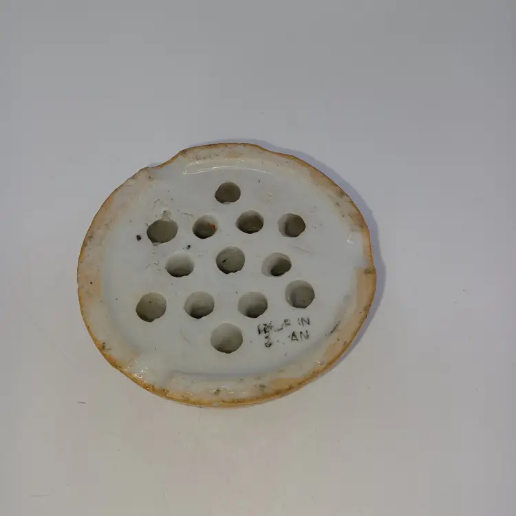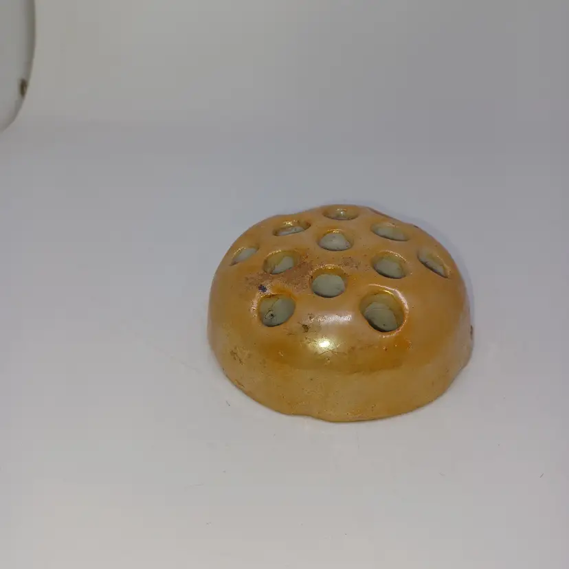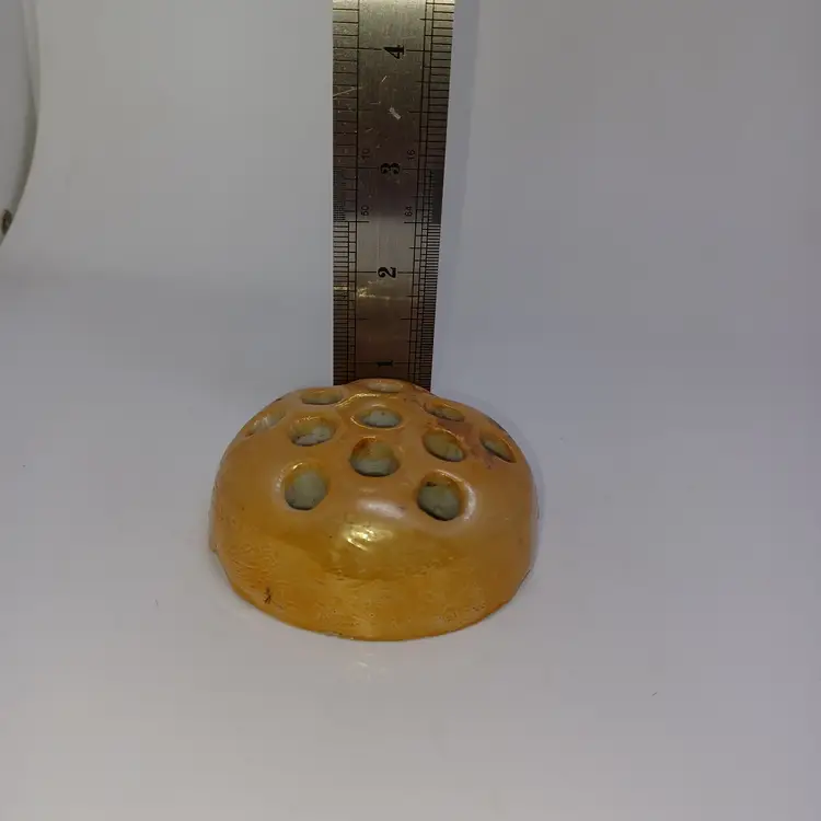 Lusterware Flower Frog with 13 Holes - Flower Frog - Mid Century Lusterware Flower Arranger - Peach Colored Flower Frog - Floral Art Marked made in Japan on bottom Vintage round lusterware flower frog with 13 holes, just perfect for flower arranging. In good vintage condition does have some manufacturing paint flaws but does not detract from use or display approximately 3 inches across the top, 3/4 inches tall. Very much in the naturalistic style of the Arts and Crafts Movement Please see photos as they are a part of the description.